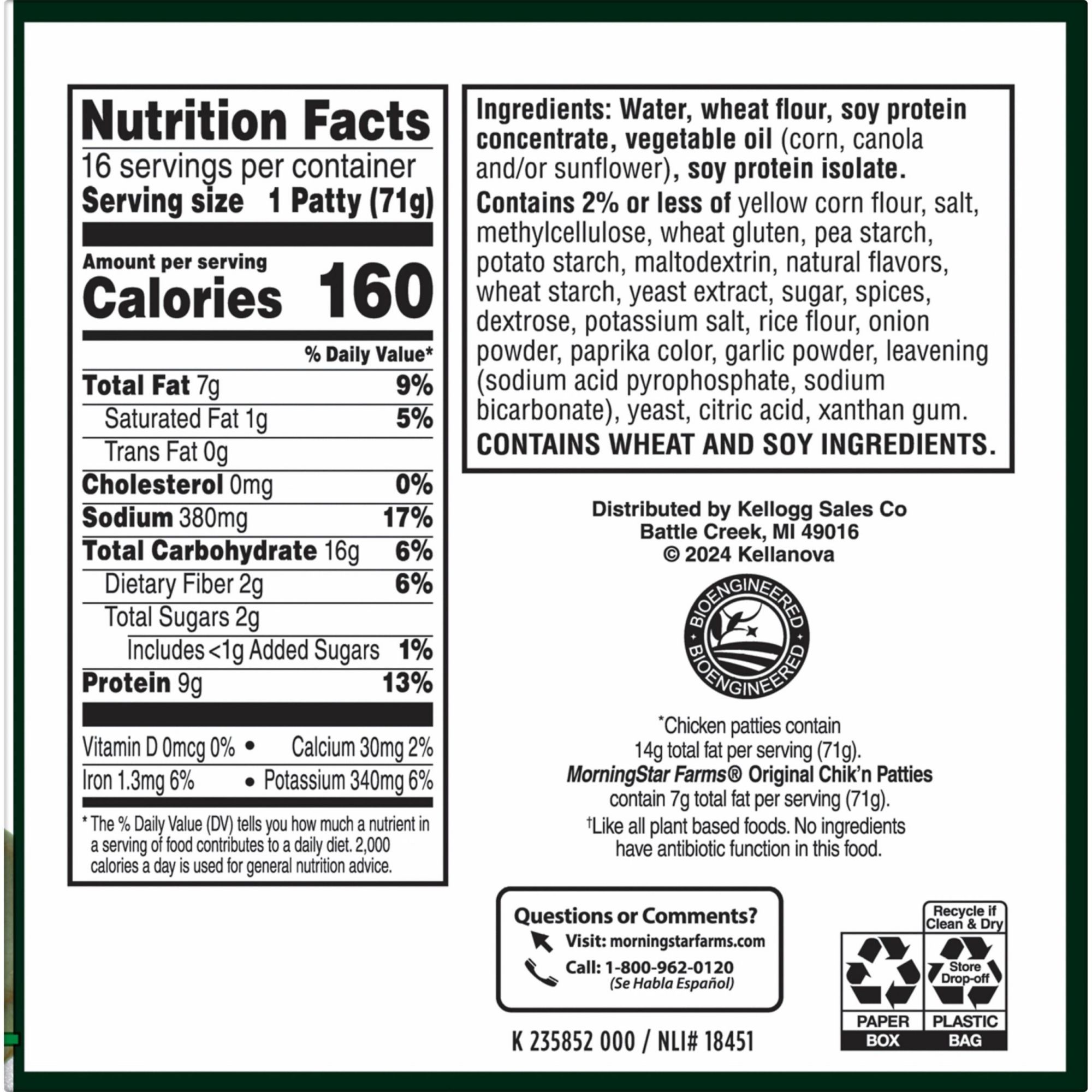 Mouthwatering and meatless, MorningStar Farms’ plant-based veggie patties are a delicious, meat-free addition to any balanced diet A seasoned chik patty with crispy, crunchy breading on the outside and a savory, tender inside; Perfect for sandwiches and wraps Good source of protein Colors and flavors from natural sources Contains wheat and soy ingredients A convenient, 100% vegan dish at lunch or dinner Includes 16 Morning Star Veggie patties