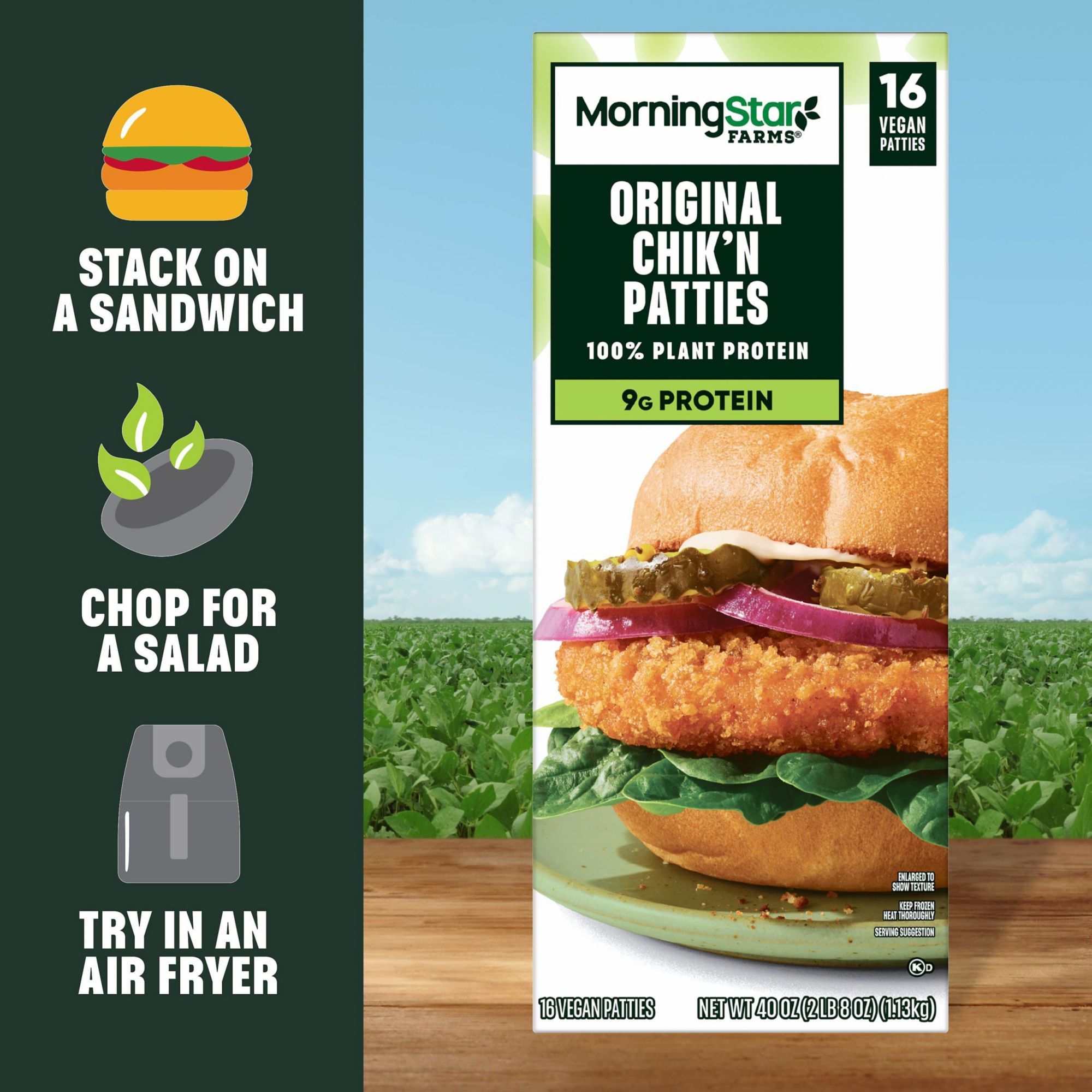 A delicious meat-free addition to any diet, MorningStar Farms Original Chik Veggie Patties are expertly seasoned and ideal for an array of savory recipes. You can use these vegan Chik Patties anytime you're looking for a meat-free alternative to chicken. Each delicious serving is 100% plant-based and offers a good source of protein (9g, 13% of your daily value) to any diet, perfect for any night of the week or special occasions with friends and family. Reach for these Chik Patties when it's time to make sandwiches, casseroles, wraps, appetizers, pasta dishes, and more—the delicious vegan options are endless. Our Chik Patties are easy to prepare; store them in the freezer until you need them, and then simply heat the patties in a conventional oven (recommended) or microwave before eating. Whether you’re seeking a quick and convenient lunch or dinner, or preparing an exciting meal for a crowd, MorningStar Farms Chik Patties are sure to delight vegetarians and meat-lovers alike.