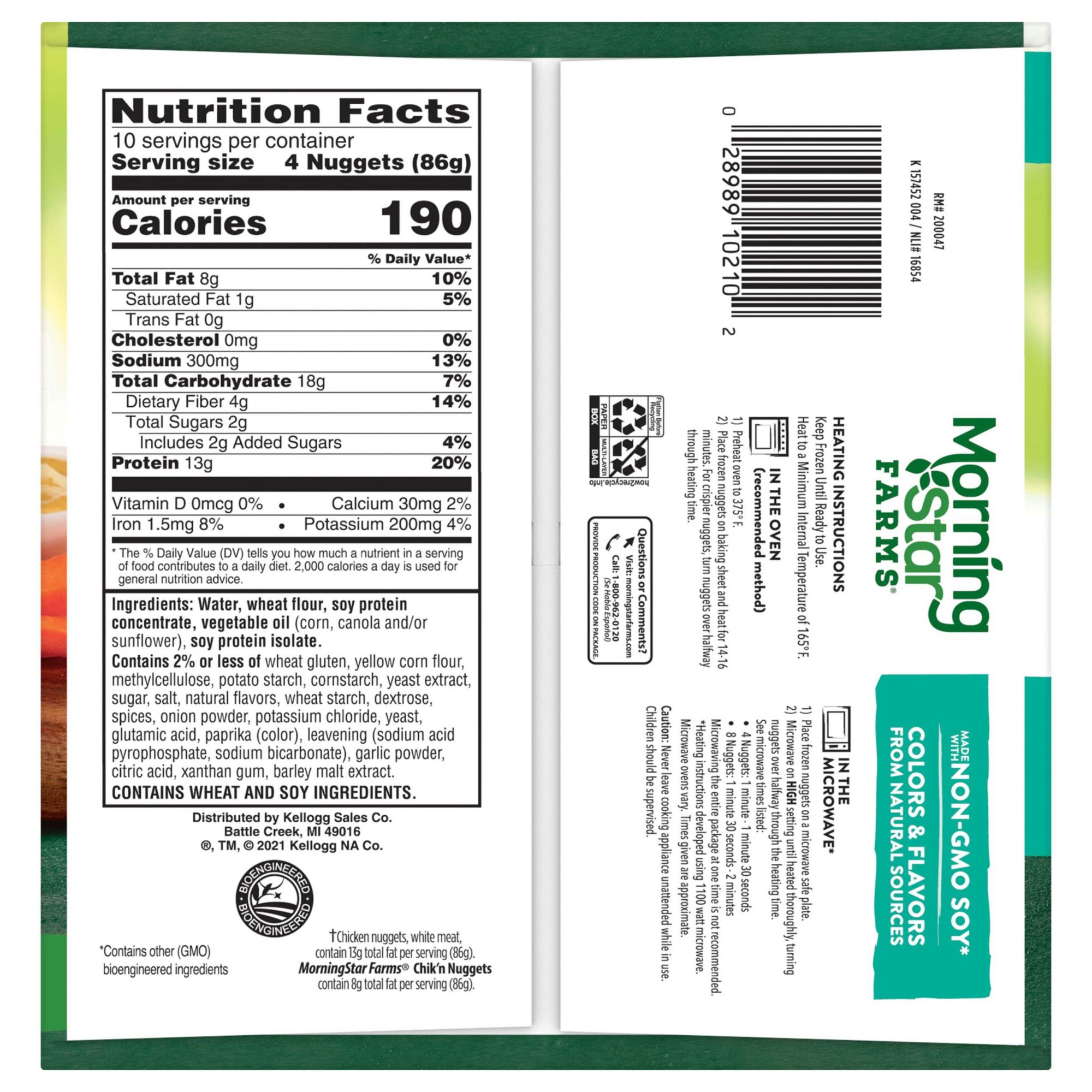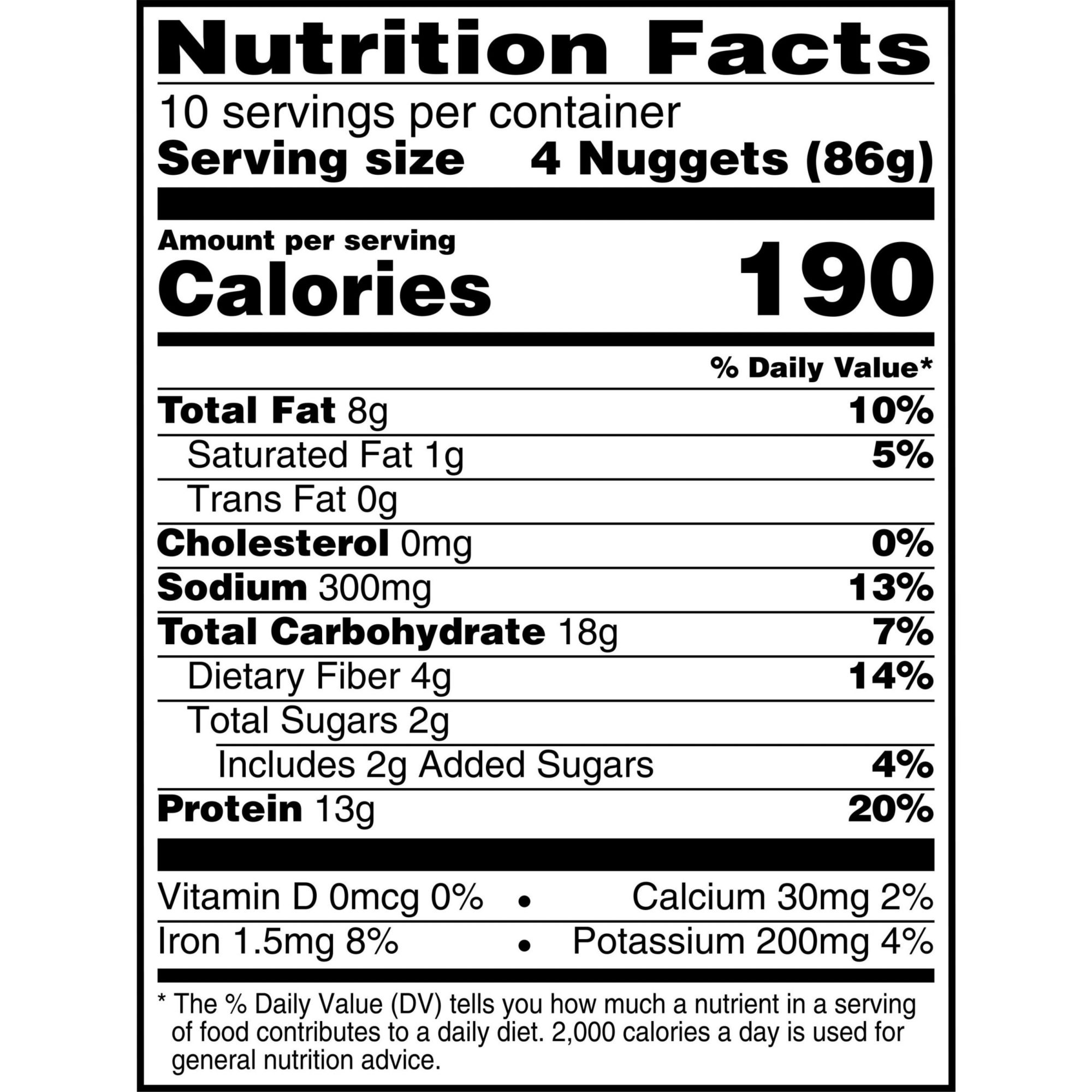 Easy to heat and eat Lightly-seasoned and crisped just right 8g of fat and 180 calories per serving Perfect for pairing with your favorite sauce Cholesterol-free Good source of fiber Good source of protein Made in the USA Includes three 10.5-oz. boxes of vegetable nuggets