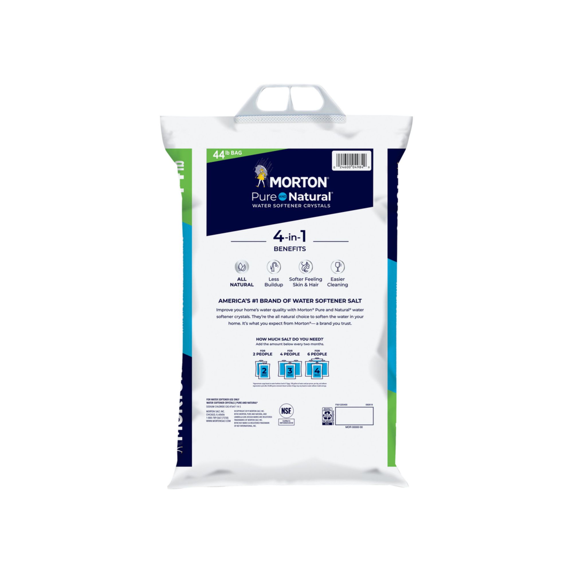 Morton® Pure and Natural® Water Softener Salt is made from all natural, high purity salt crystals. For the many households that have hard water, it is a natural solution for softer water that provides many added benefits. Using Morton Water Softener Salt Crystals help not only to decrease the buildup hard water can cause in pipes and appliances and make dishes easier to clean, but also leave hair and skin feeling softer after washing and bathing. To continue to see the benefits of Morton Water Softener Salt Crystals, it is recommended that every other month you add between two and four new bags to your tank, depending on the number of people in your household. In order to make carrying and pouring our 44 lb. bags easier, this bag features a sturdy plastic handle and an easy-tear opening.