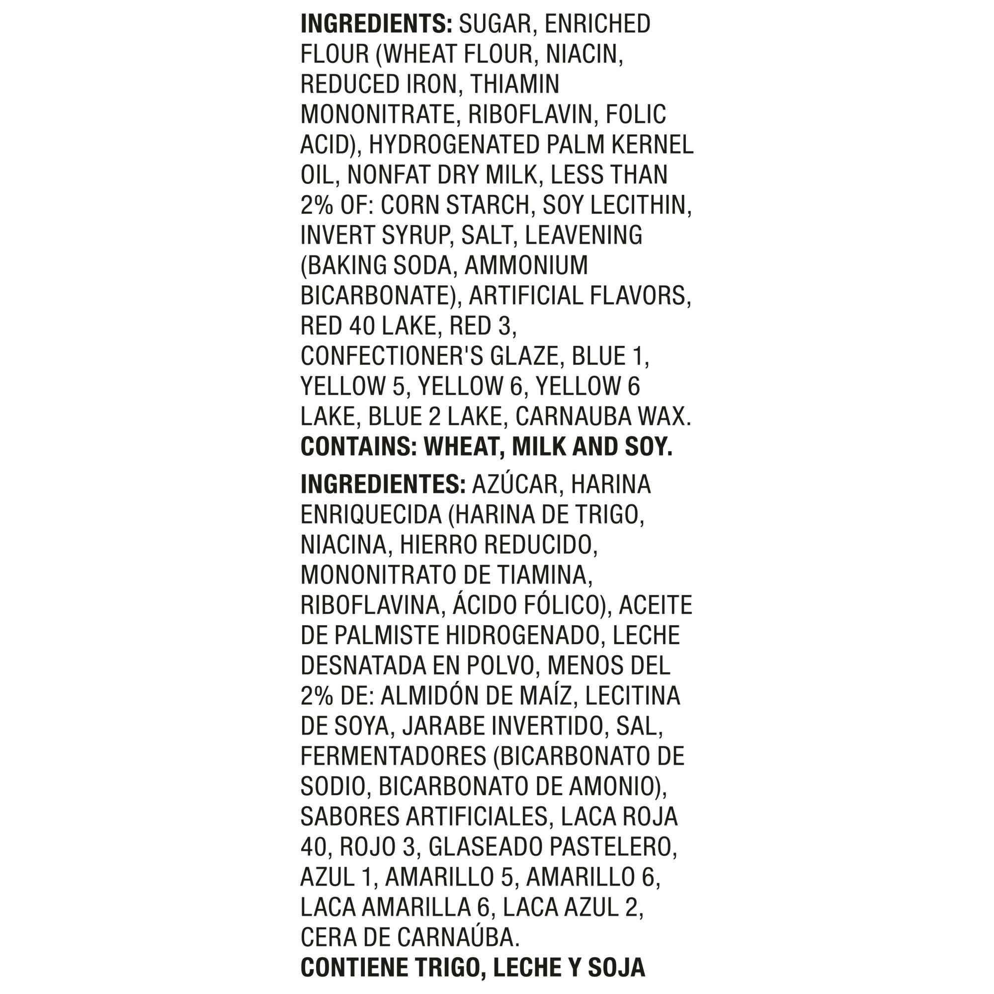 Ingredients: Sugar, Enriched Flour (Wheat Flour, Niacin, Reduced Iron, Vitamin B1 [Thiamin Mononitrate], Vitamin B2 [Riboflavin], Folic Acid), Hydrogenated Palm Kernel Oil, Nonfat Milk, Cornstarch, Contains 2% Or Less Of High Fructose Corn Syrup, Salt, Soy Lecithin, Artificial Flavors, Baking Soda, Confectioner's Glaze, Carnauba Wax, Color Added, Red 3, Red 40 Lake, Yellow 5, Blue 1, Blue 2 Lake, Yellow 6 Lake, Yellow 6.