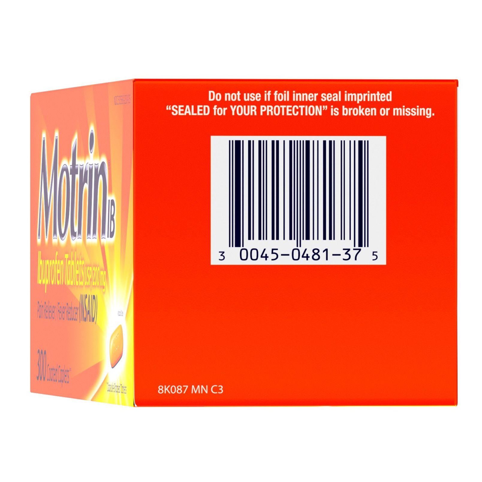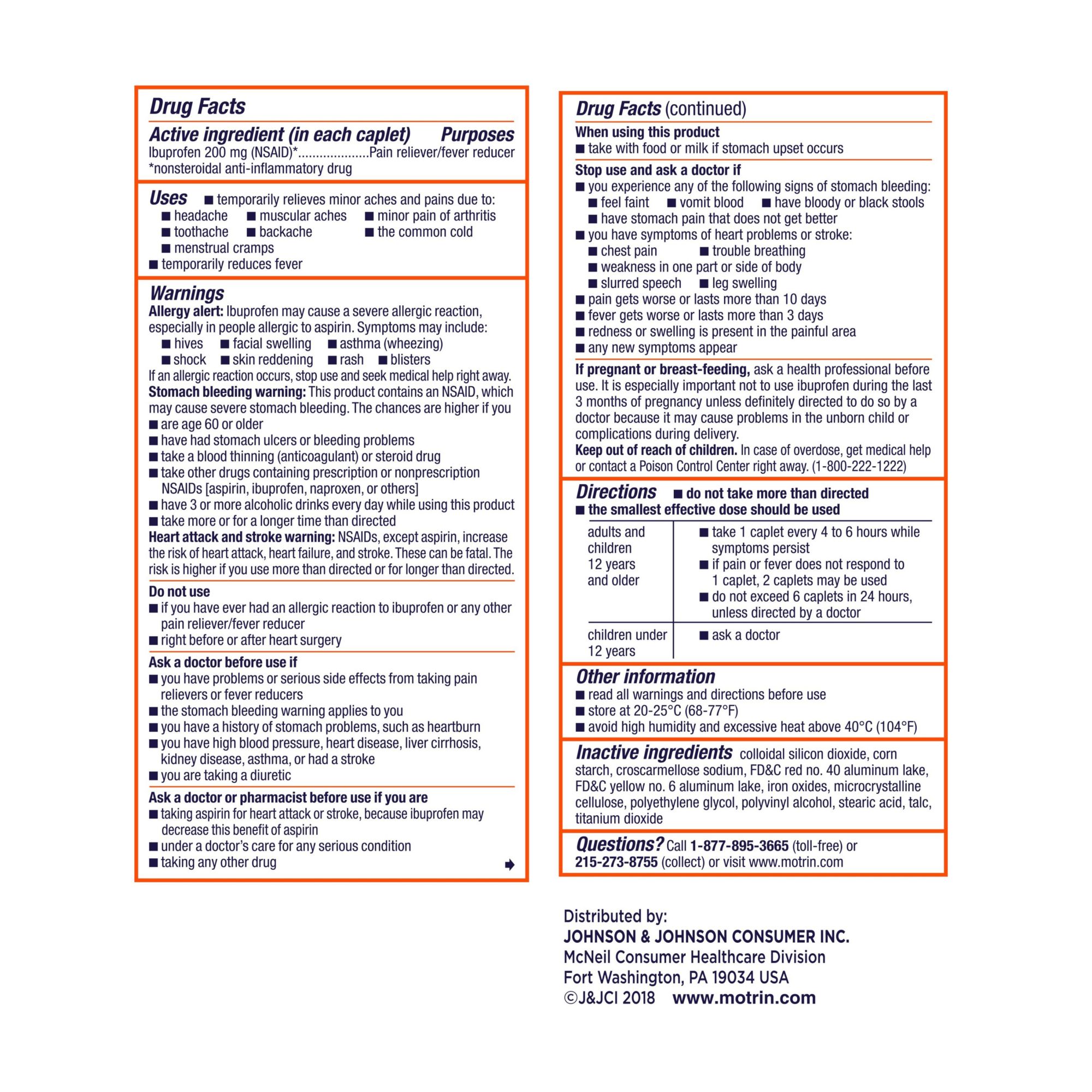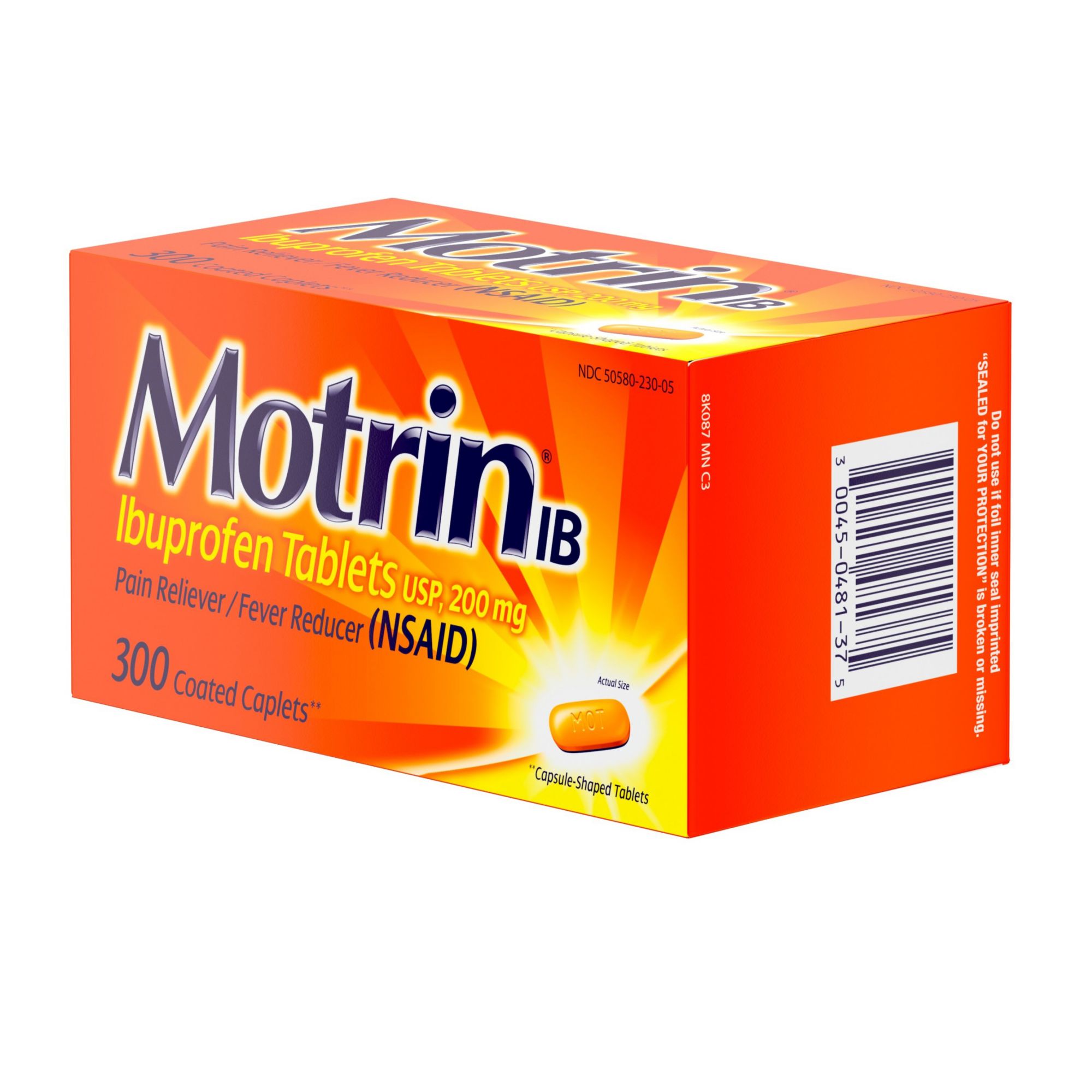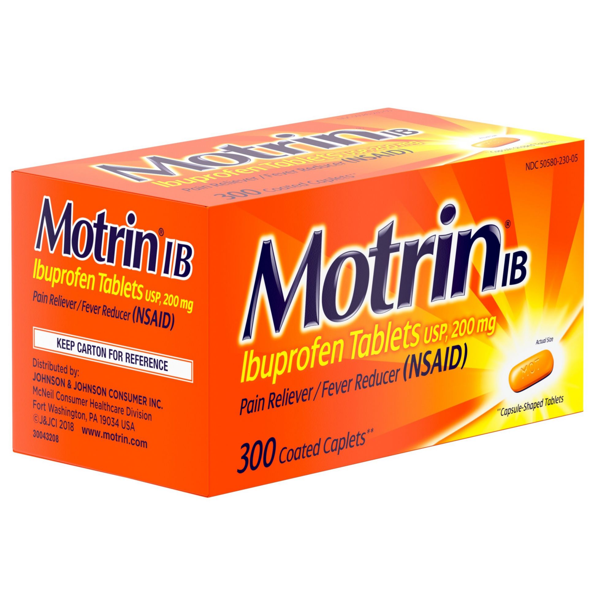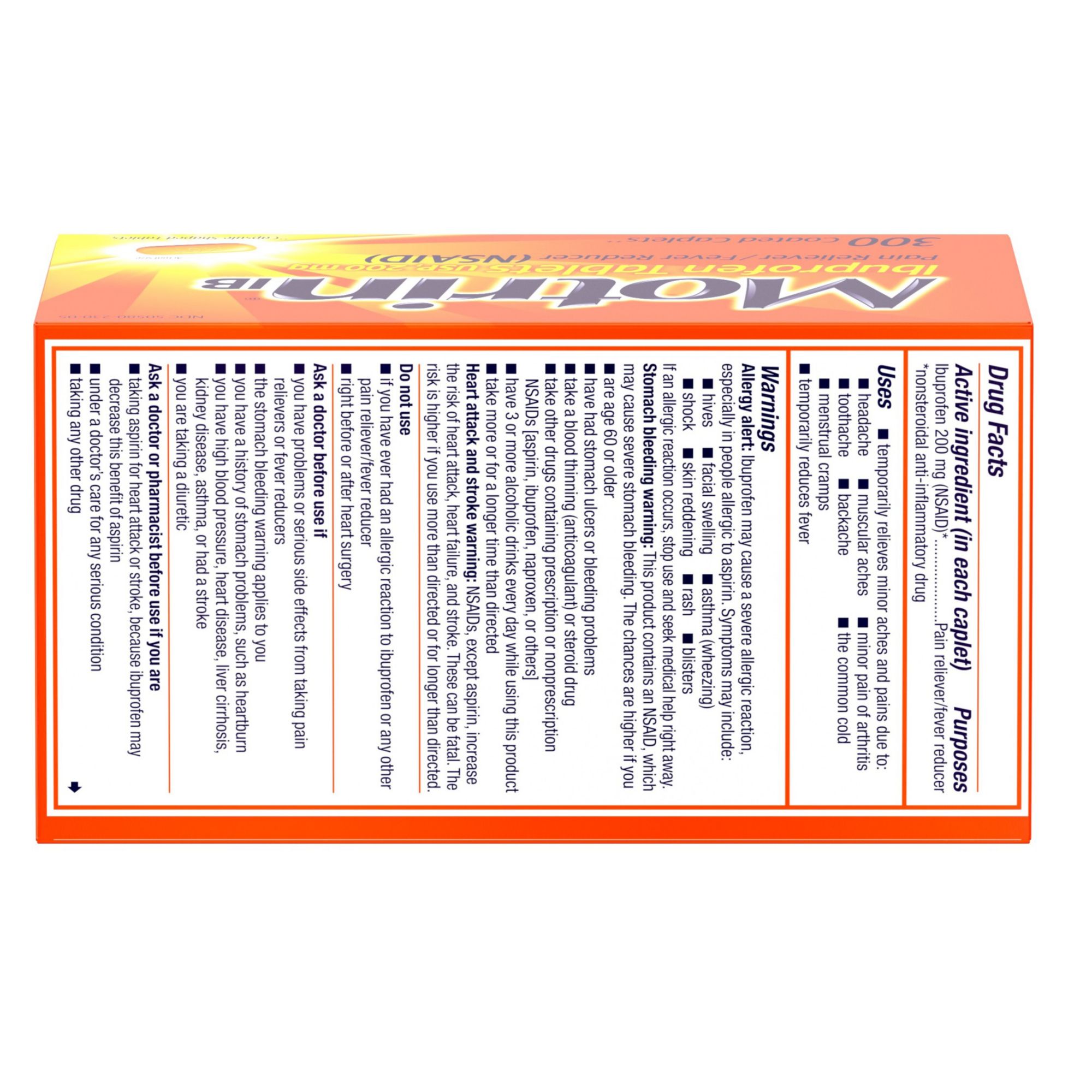 Motrin IB temporarily relieves minor aches and pains due to headache, muscular aches, minor pain of arthritis, toothache, backache, menstrual cramps and the common cold. It also temporarily reduces fever. Each Motrin IB caplet contains 200 milligrams of ibuprofen. Each bottle includes a 300-count of caplets.