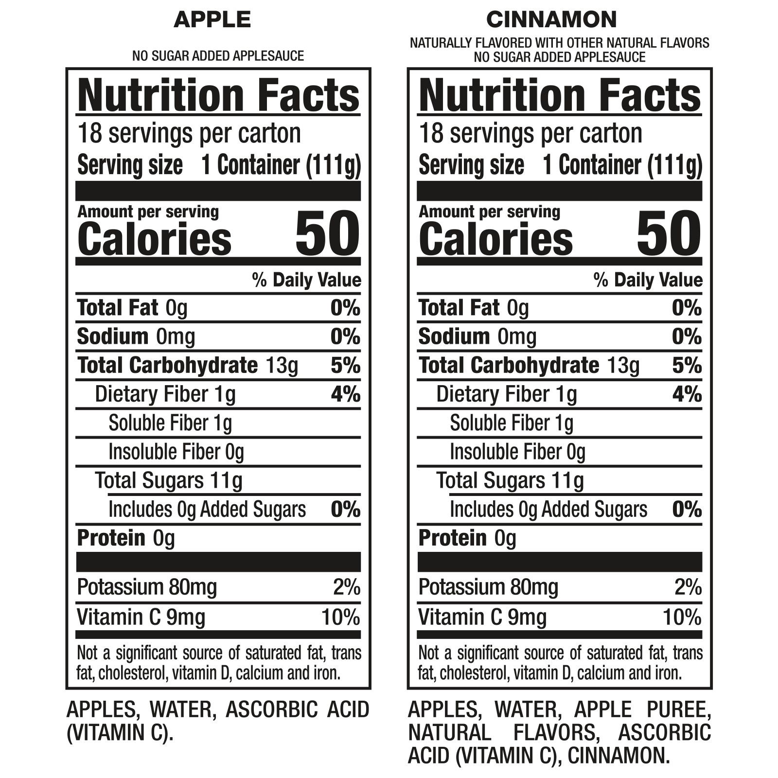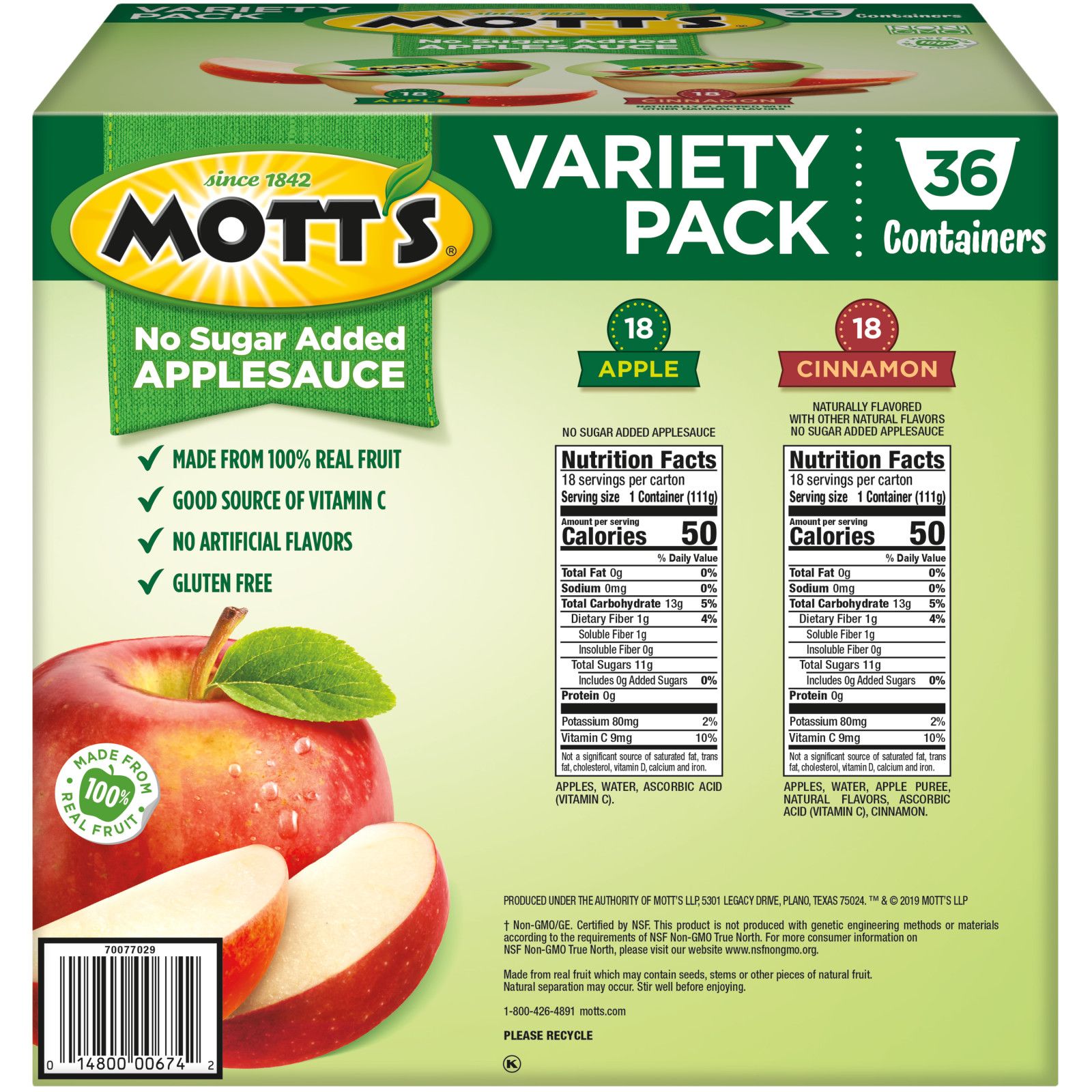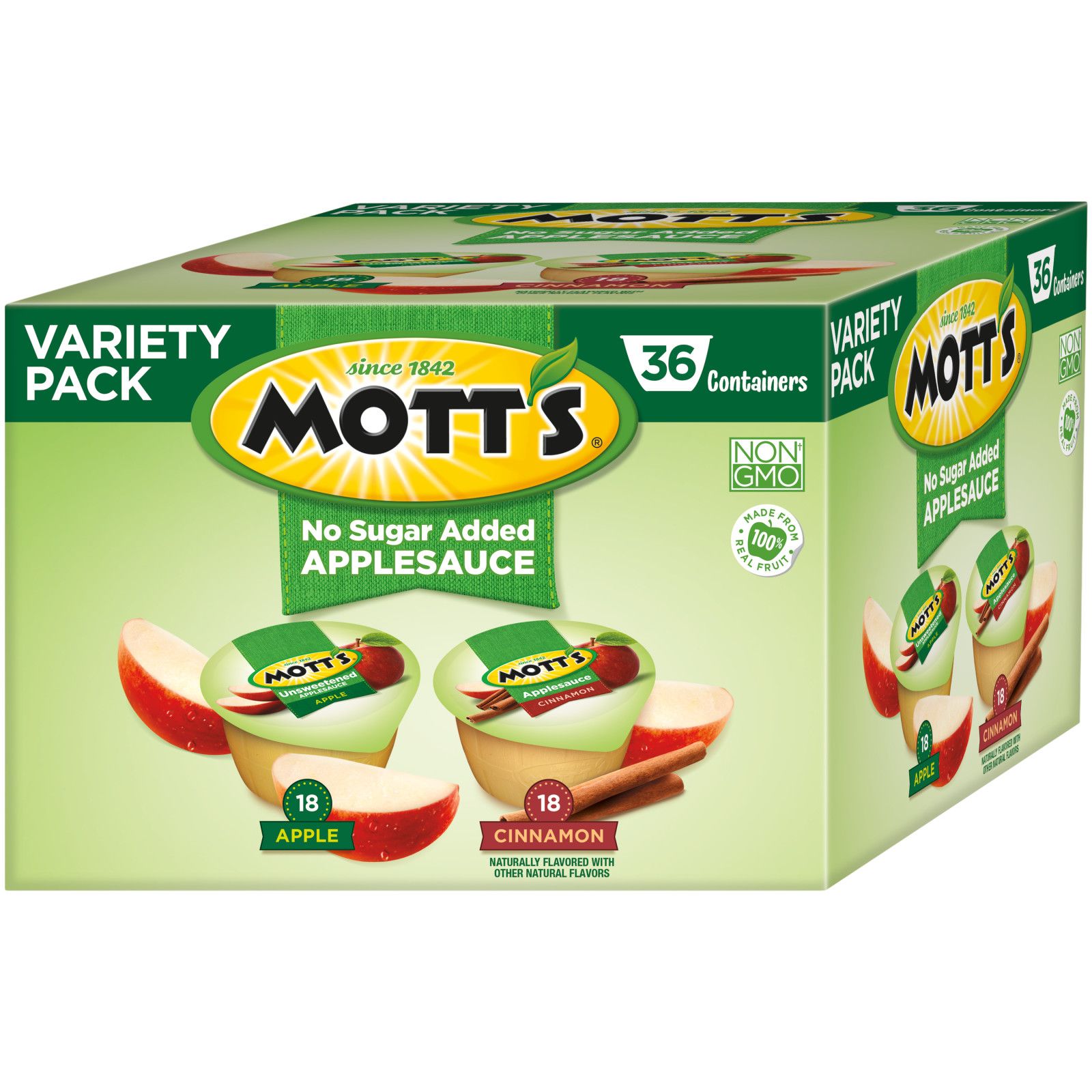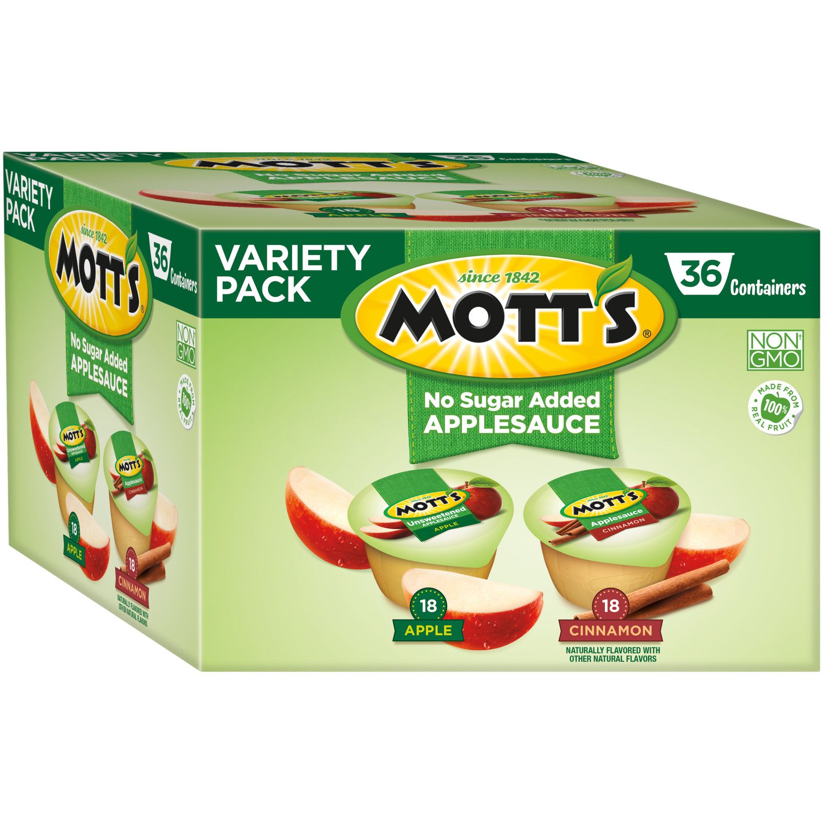Club Pack One 36-count of 3.9 ounce cups 18 Apple and 18 Cinnamon No Sugar Added applesauce cups Mott's No Sugar Added applesauce cups are a healthier snack alternative and great lunchbox addition An excellent source of vitamin C