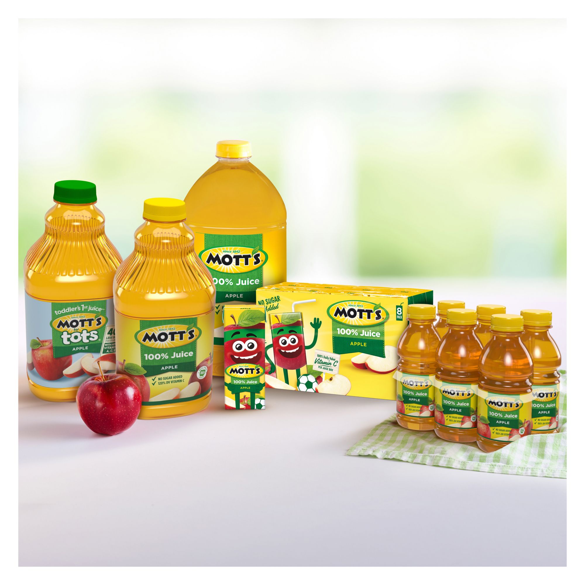 Natural goodness: Mott’s Apple Juice is gluten-free, caffeine-free, Kosher, and contains no artificial colors or sweeteners