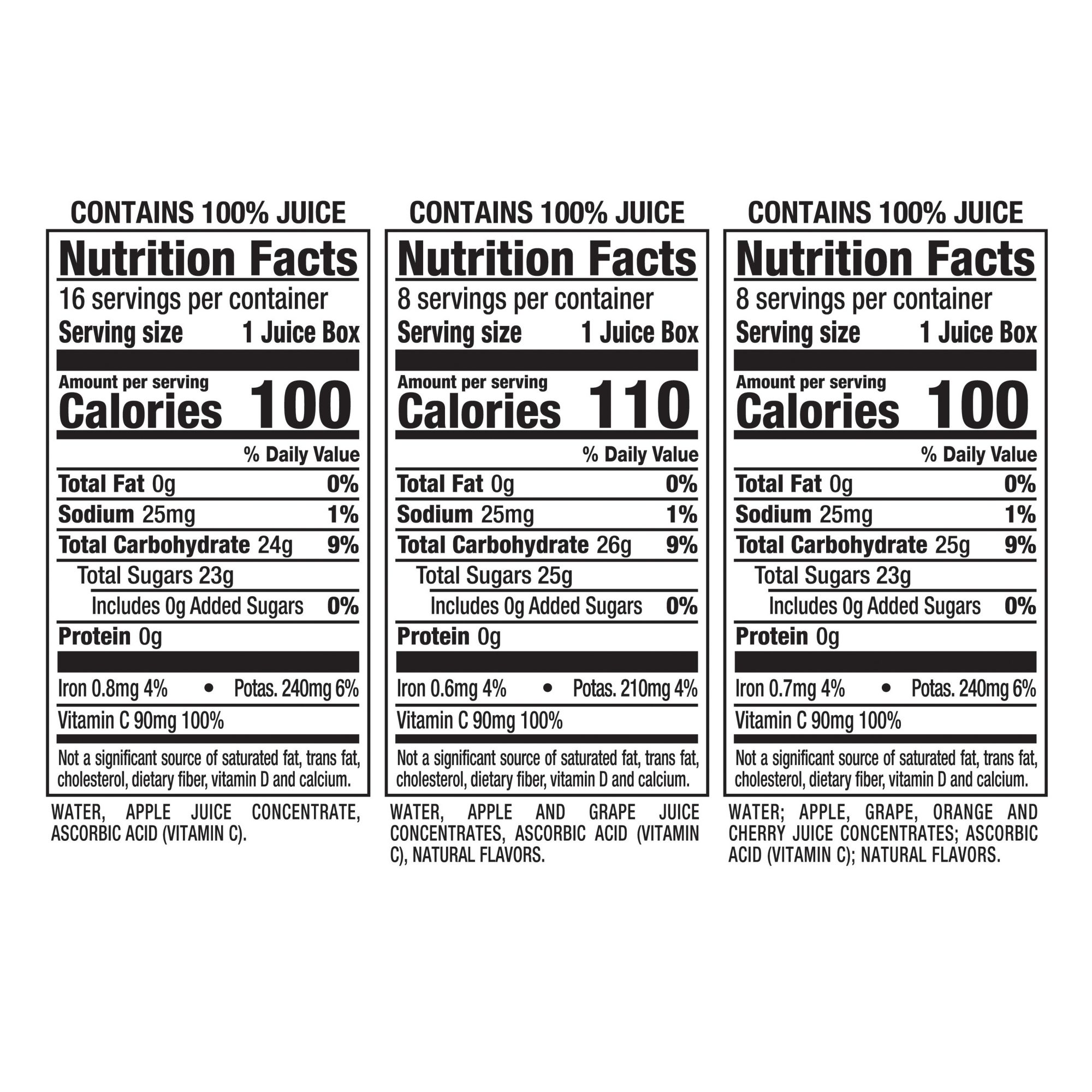 Ingredients: Apple Juice: Water, Apple Juice Concentrate, Ascorbic Acid (Vitamin C); Apple White Grape Juice: Water, Apple and Grape Juice Concentrates, ascorbic acid (vitamin C), Natural flavors; Fruit Punch: Water, Apple, Grape, Orange, and Cherry Juice Concentrates, Ascorbic Acid (Vitamin C), Natural Flavors.
