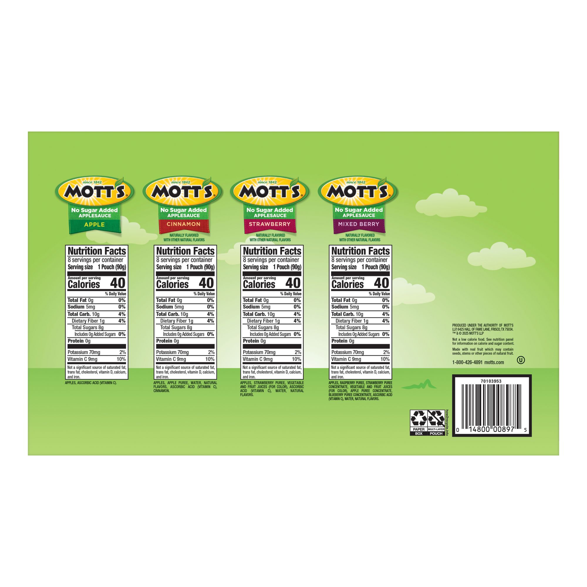 Good for you: A good source of Vitamin C and free of cholesterol, Mott's No Sugar Added Applesauce Variety Pack brings the best of the orchard to your household to help families enjoy delicious fruit goodness every day.