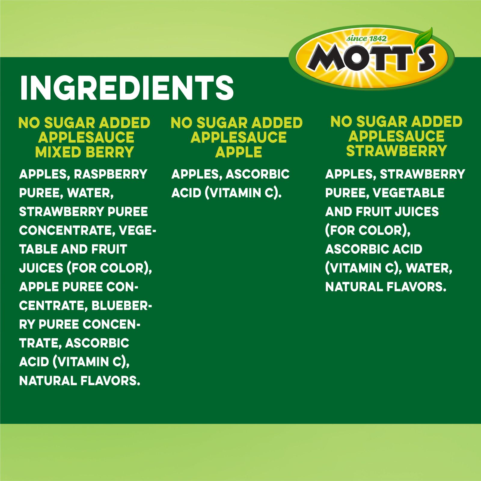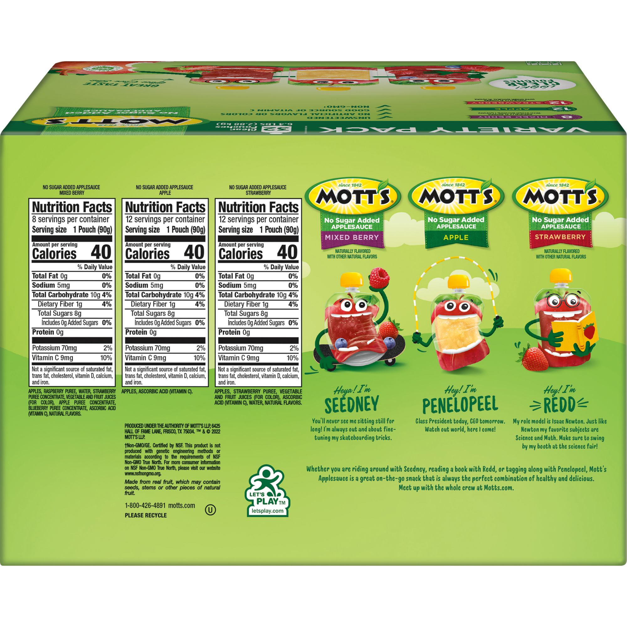 With three delicious varieties in one convenient variety pack, Mott's No Sugar Added Applesauce is a nutritious snack with something for everyone. Made with real, high-quality apples, strawberries and mixed berries, Mott's No Sugar Added Applesauce is perfect for a tasty treat at home or on-the-go. You won't find any artificial flavors, sweeteners or colors in Mott's No Sugar Added products, so you can feel good about making healthy choices for your family. And the convenient 3.2 oz. clear pouches are easy to toss in a bag, a lunch box or picnic basket. Apples have always nourished us, inspired us, and provided for us. Mott's provides the nutrition and taste of real fruit that families have trusted since 1842, when Mott's founder, Samuel R. Mott, began growing and packaging apples in New York. In the years since, Mott's commitment to apple excellence and high-quality products has continued to provide healthy, delicious juices and snacks. Treat your family to the classic taste of Mott's No Sugar Added Applesauce.