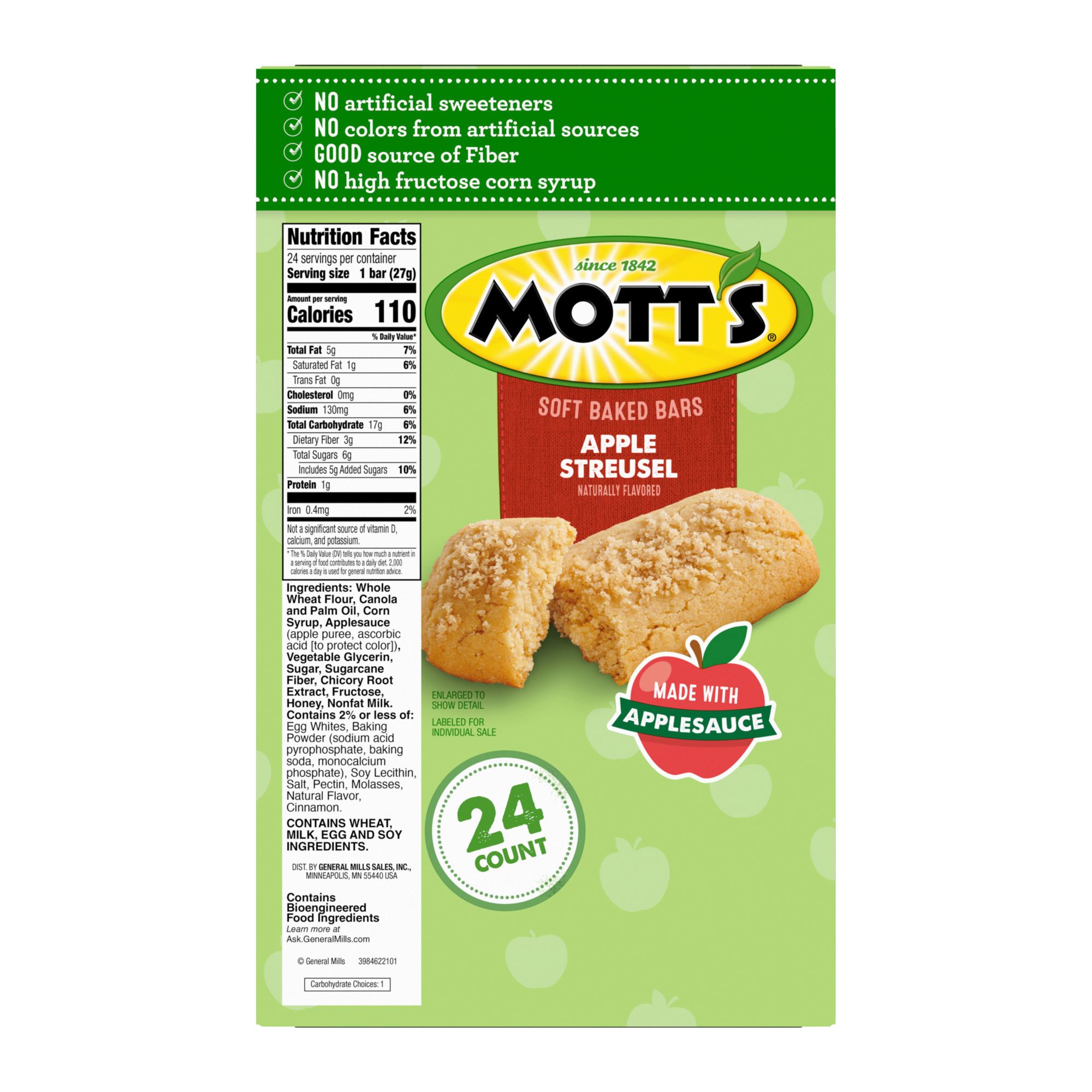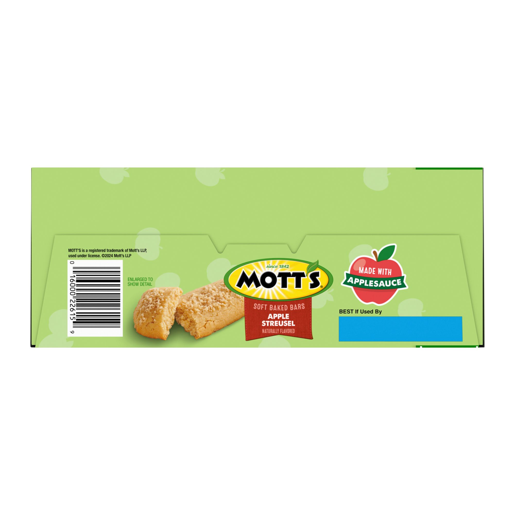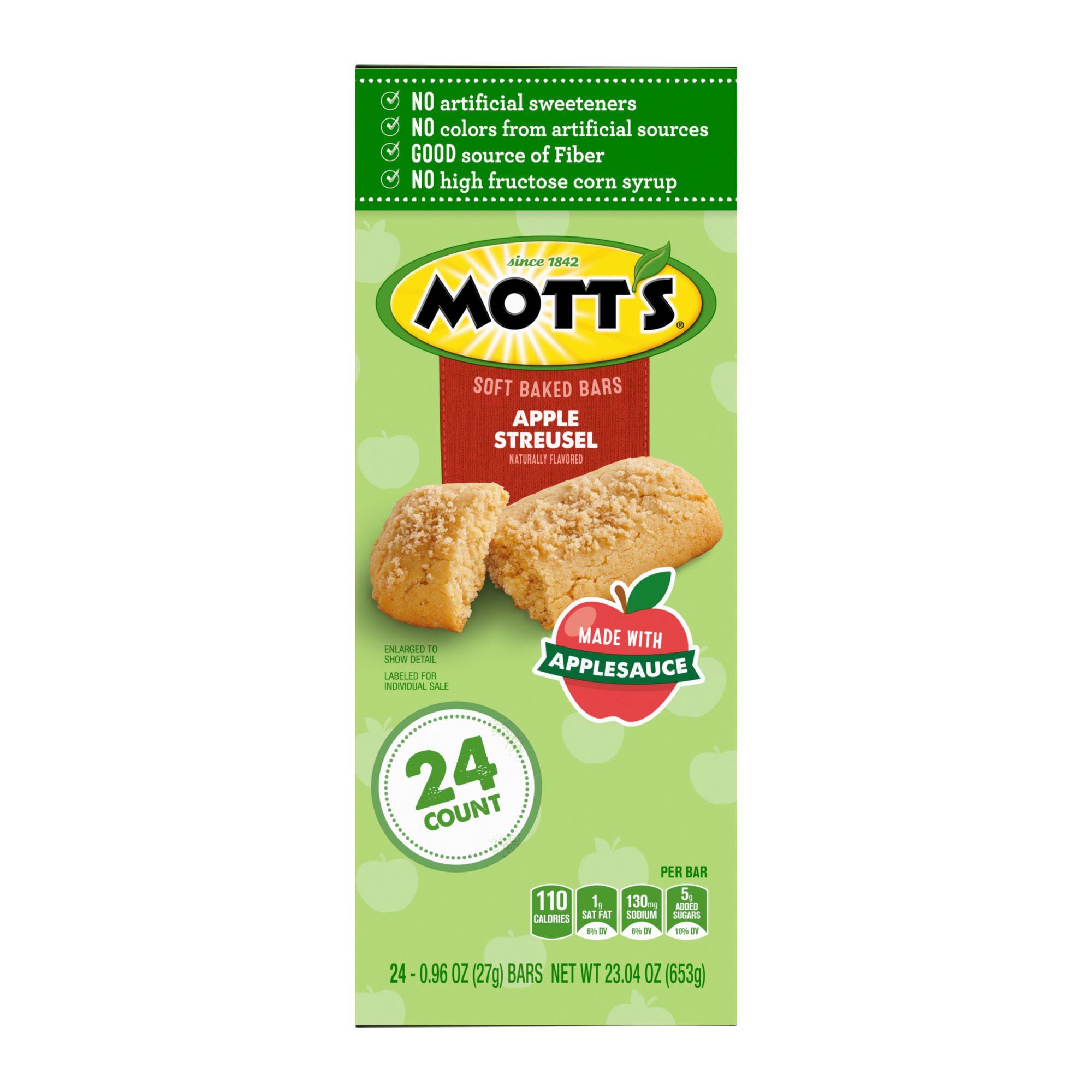 Soft baked bars: Mott's Apple Streusel Soft-Baked Bars provide the goodness of a soft bar to-go; with wholesome ingredients for a breakfast snack, lunch box, or afternoon snack the entire family will enjoy