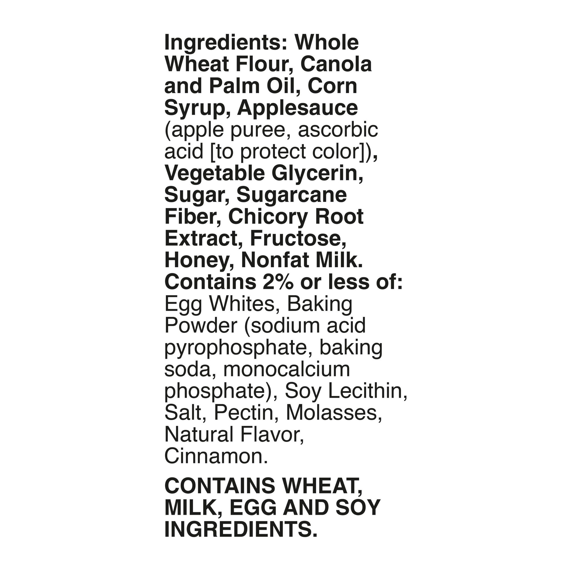 Ingredients: Whole Wheat Flour, Canola And Palm Oil, Corn Syrup, Applesauce (Apple Puree, Ascorbic Acid [To Protect Color]), Vegetable Glycerin, Sugar, Sugarcane Fiber, Chicory Root Extract, Fructose, Honey, Nonfat Milk. Contains 2% Or Less Of: Egg Whites, Baking Powder (Sodium Acid Pyrophosphate), Soy Lecithin, Salt, Pectin, Molasses, Natural Flavor, Cinnamon.