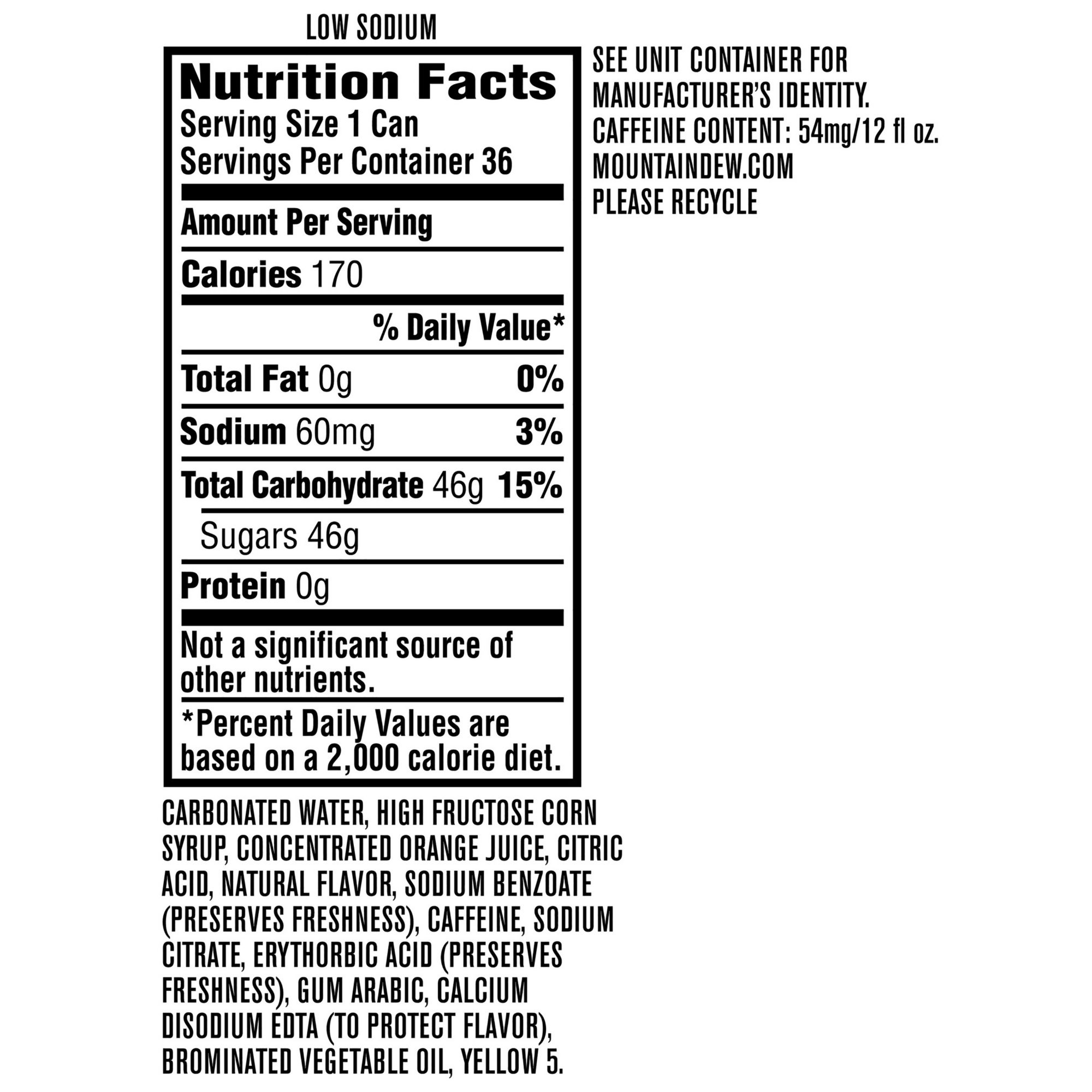 Mtn Dew exhilarates and quenches with its one of a kind, bold taste Crack open a cold can of Mtn Dew and refresh your taste buds Includes thirty-six 12 oz. cans of soda Perfect for parties, meals, and celebrations big and small Contains caffeine
