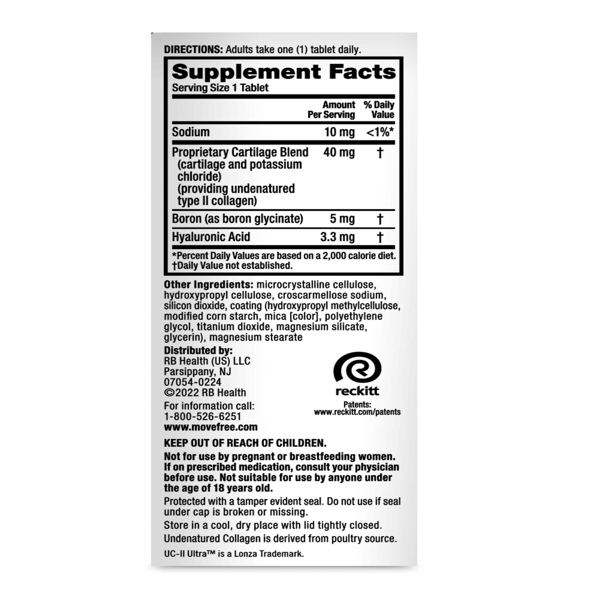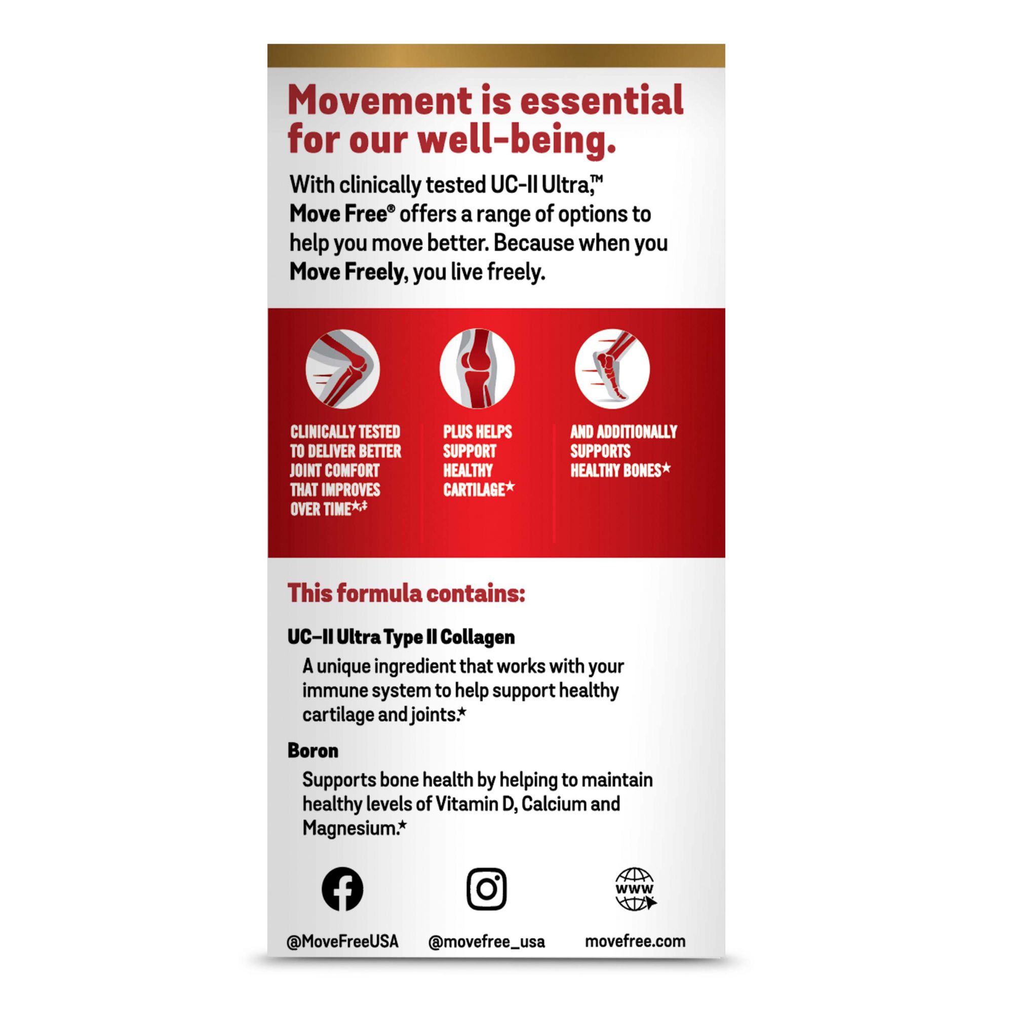 Move Free Ultra Triple Action supports your joints, cartilage and bones in just one tiny pill, so you can stay moving and keep up with your daily activities with key ingredients. Ingredients include type II collagen, a protein found in healthy cartilage, hyaluronic acid and boron. This pack includes 75 Move Free Ultra Triple Action Dietary Supplement Tablets.
