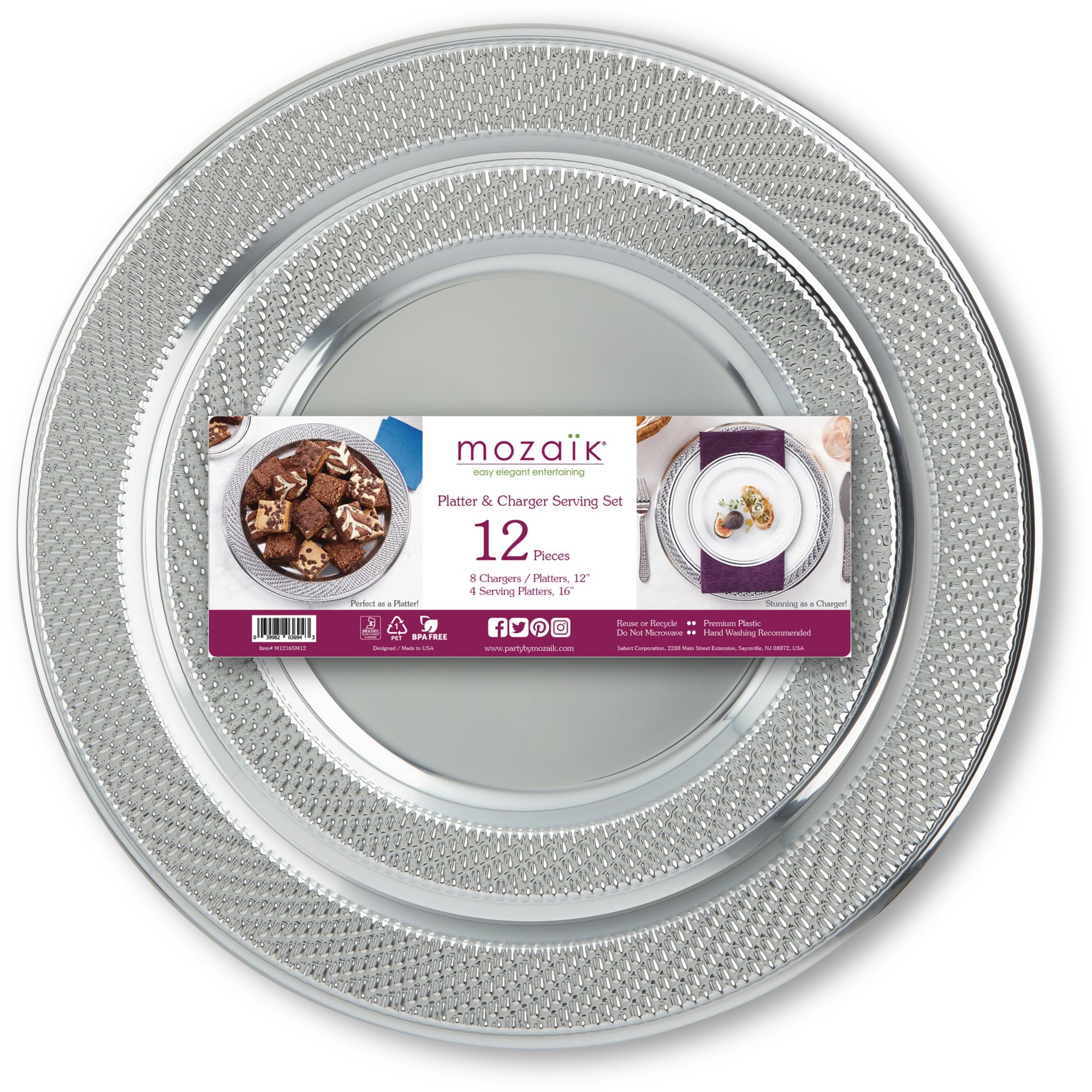 BPA free Sturdy premium plastic Reuse or recycle Elegant for entertaining Includes 12-count woven platter and charger serving set