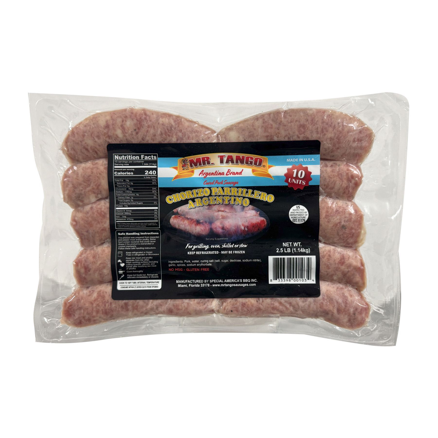Includes Argentinian brand cured pork sausages, 10 ct.