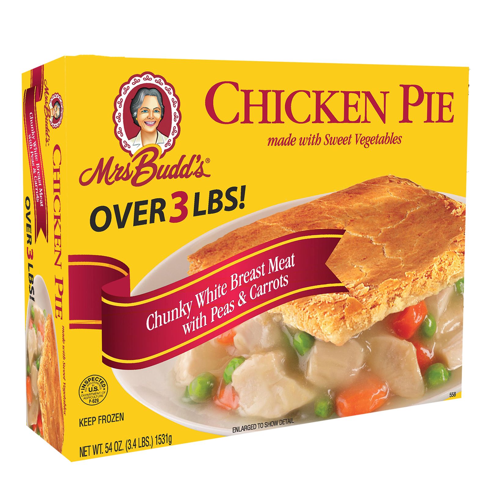 Mrs. Budd's has been making chicken pies in the New Hampshire bakery. They are famous for the thick crust, and high-quality ingredients. You will find lots of tender chunks of white meat chicken, peas, and carrots in a delicious supreme sauce, all topped with the golden, flaky crust.