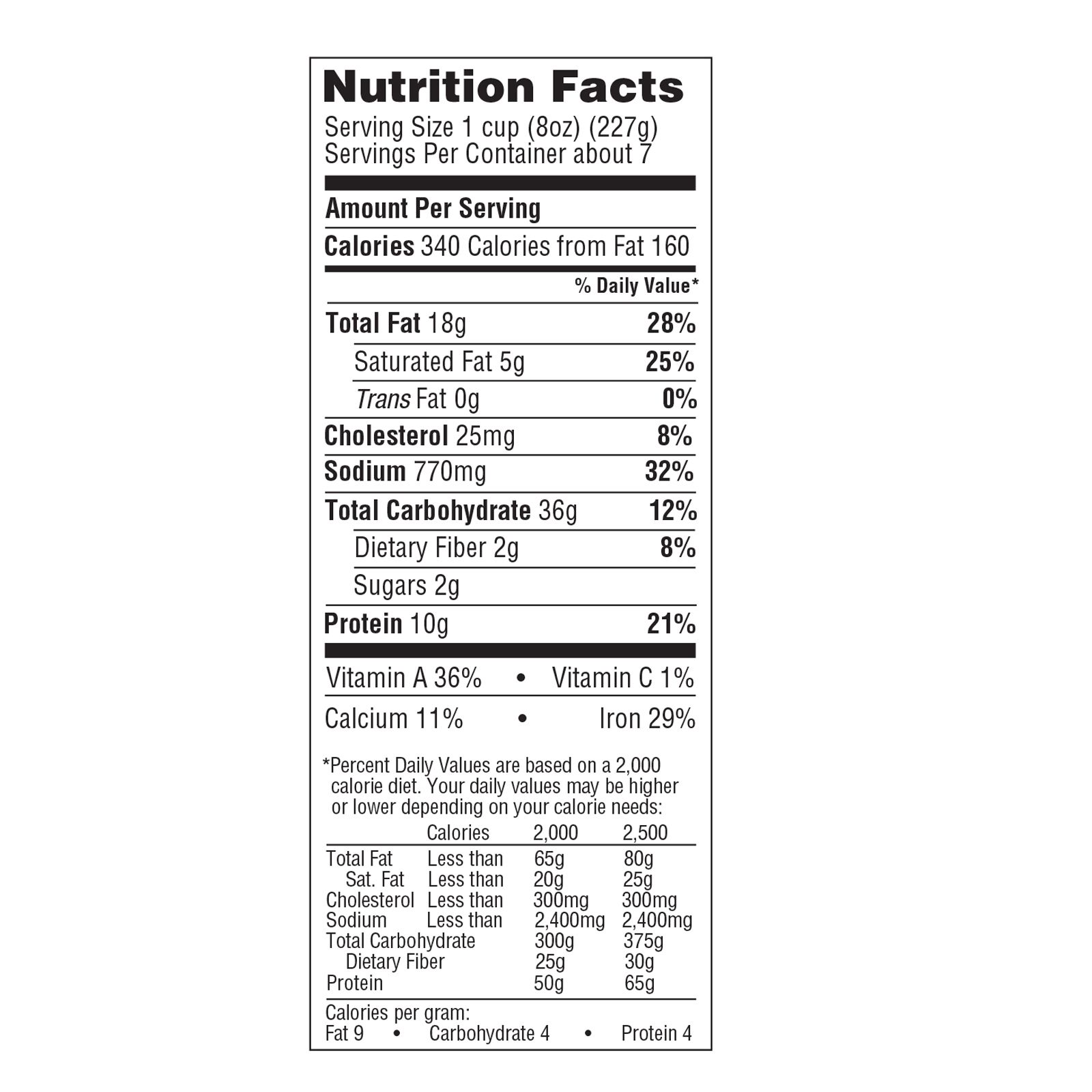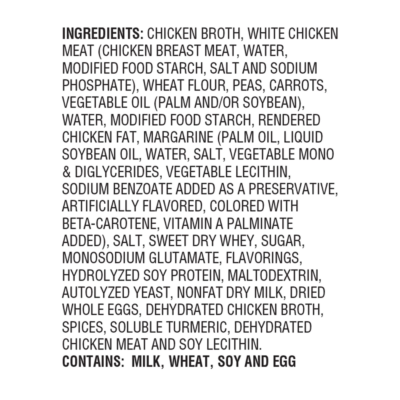 Ingredients:Chicken Broth, White Chicken Meat (Chicken Breast Meat, Water, Modified Food Starch, Salt, and Sodium Phosphate), Wheat Flour, Peas, Carrots, Vegetable Oil (Palm and/or Soybean), Water, Modified Food Starch, Rendered Chicken Fat, Margarine (Palm Oil, Liquid Soybean Oil, Water, Salt, Vegetable Mono, and Diglycerides, Vegetable Lecithin, Sodium Benzoate Added as a Preservative, Artificially Flavored, Colored With Beta-carotene, Vitamin a Palmitate Added), Salt, Sweet Dry Whey, Sugar, Monosodium Glutamate, Flavorings, Hydrolyzed Soy Protein, Maltodextrin, Autolyzed Yeast, Nonfat Dry Milk, Dried Whole Eggs, Dehydrated Chicken Broth, Spices, Soluble Turmeric, Dehydrated Chicken Meat, and Soy Lecithin