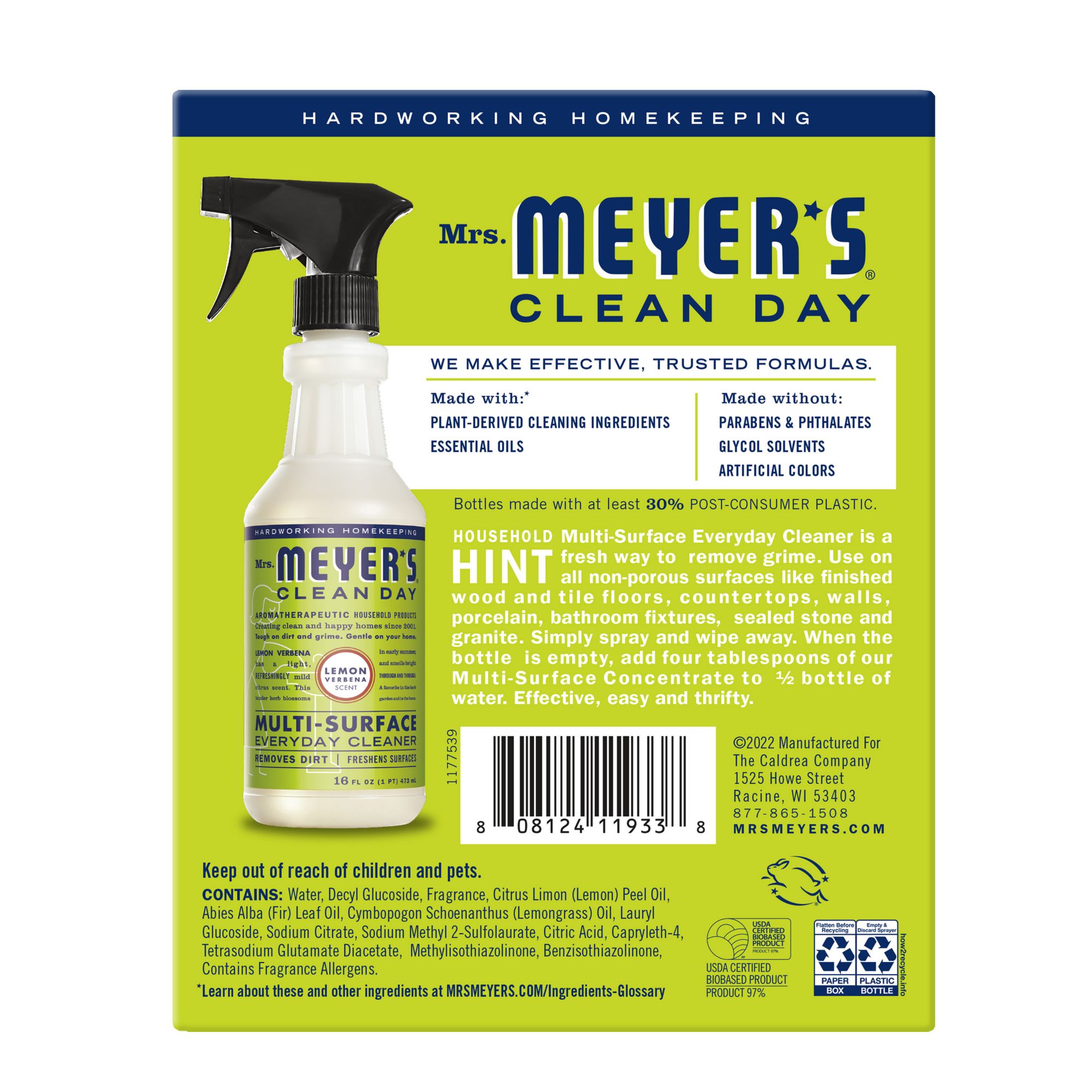 Mrs. Meyer's Clean Day Multi-Surface Everyday Cleaners feature hard-working yet gentle multi purpose cleaning agents, while also providing a special, singular scent for your entire home. This Lemon Verbena scented cleaner has a light, refreshingly mild citrus scent. This tender herb blossoms in early summer and smells bright and new through and through. Mrs. Meyer's combines garden inspired scents, essential oils, and plant-derived multi purpose cleaning ingredients to clean kitchen messes and all over the house. This cleaning spray is great on all non-porous surfaces such as finished wood and tile floors, countertops, walls, porcelain, bathroom fixtures, sealed natural and synthetic stone, and more. Available in other garden inspired scents and biodegradable products such as dish soaps and laundry detergents. Mrs. Meyer’s – rooted in goodness.