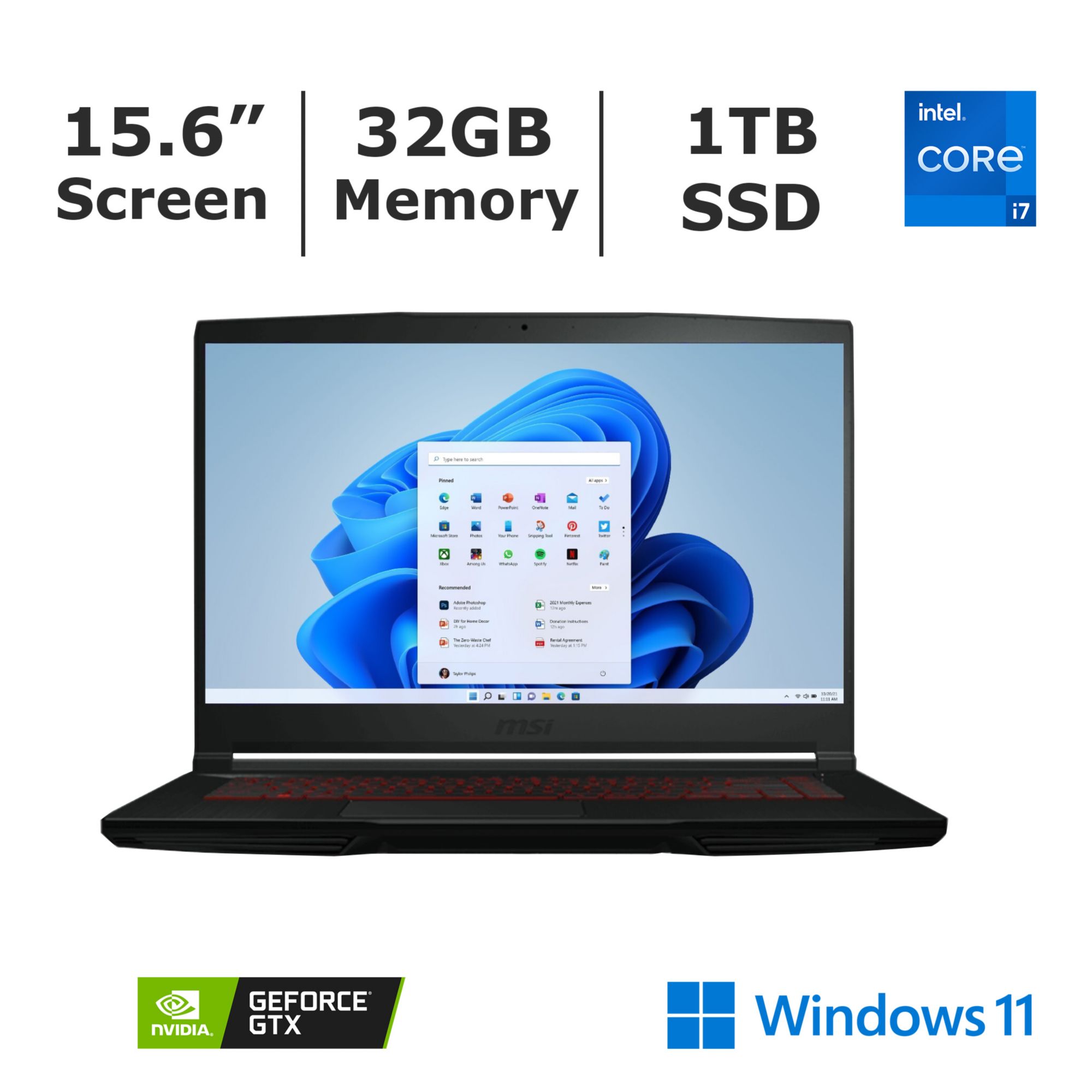 MSI Thin GF63 15.6" FHD Laptop, Intel Core i7 Processor, 32GB RAM, 1TB SSD, NVIDIA RTX 4060 Graphics