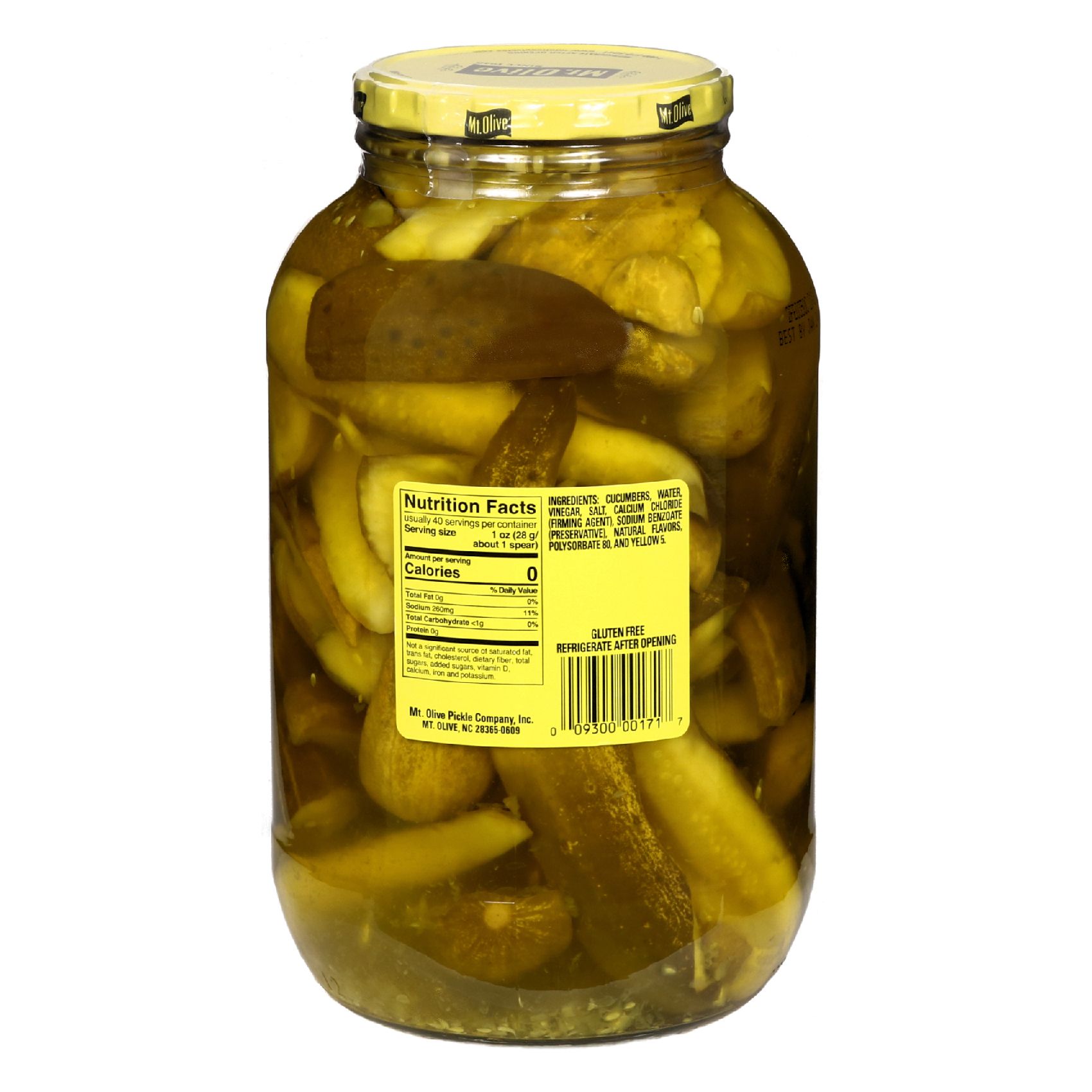 Ingredients: Cucumbers, Water, Vinegar, Salt, Calcium Chloride, Sodium Benzoate, Natural Flavors, Polysorbate 80, Yellow #5.