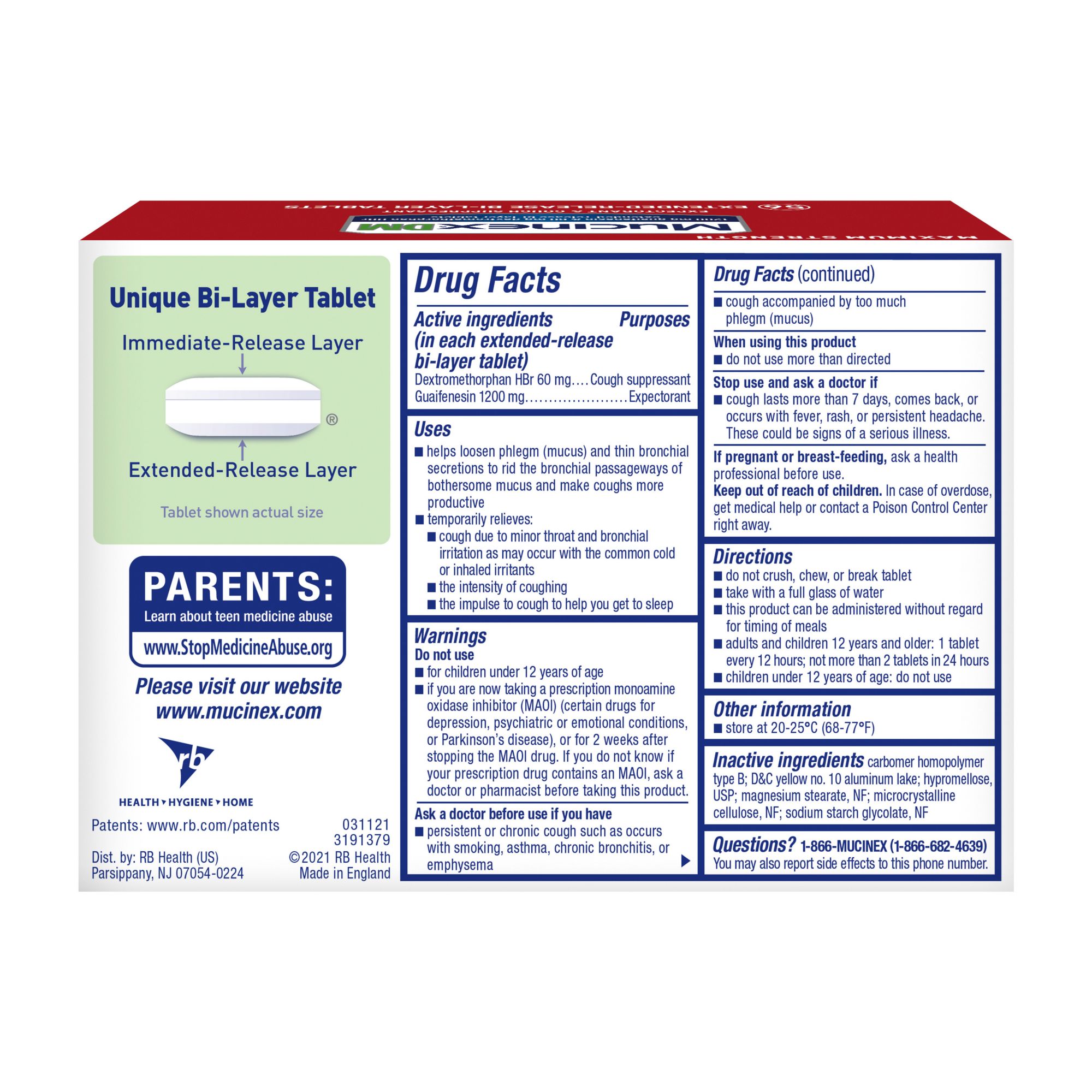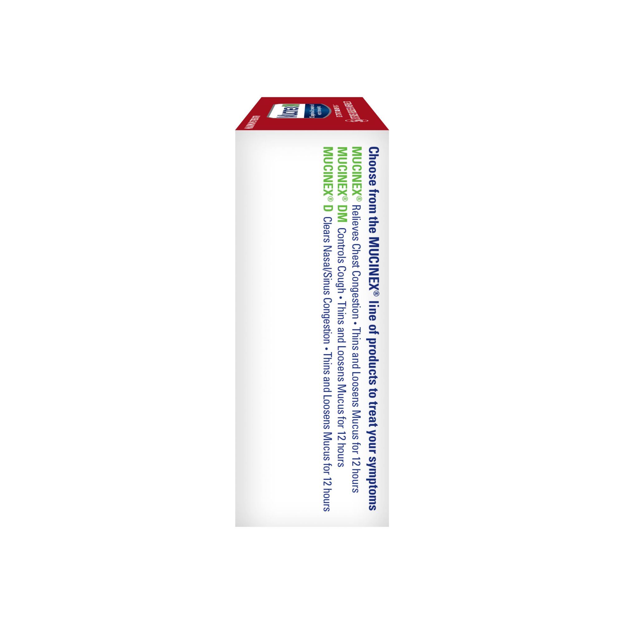 Mucinex DM Extended-release Bi-layer tablets provide powerful symptom relief. The product controls cough, relieves chest congestion, thins, and loosens mucus and lasts for 12 hours. It contains a unique bi-layer tablet - one layer for immediate release and one layer for extended release, so the medicine starts to release right away and lasts for up to 12 hours, so you can say goodbye to retaking medicine every 4 hours. Mucinex is the #1 Cold and Cough brand doctors trust for themselves and their families* and the #1 Pharmacist Recommended Brand† as well. This product contains 56 tablets. It can be used by Adults and Children 12 years of age and over. Key Symptoms Relieved: Mucinex DM Extended-release Bi-layer tablets control cough, relieve chest congestion and thin and loosen mucus *IQVIA using ProVoice Survey, August 2020 †U.S. News & World Report/Pharmacy Times 2020-2027.
