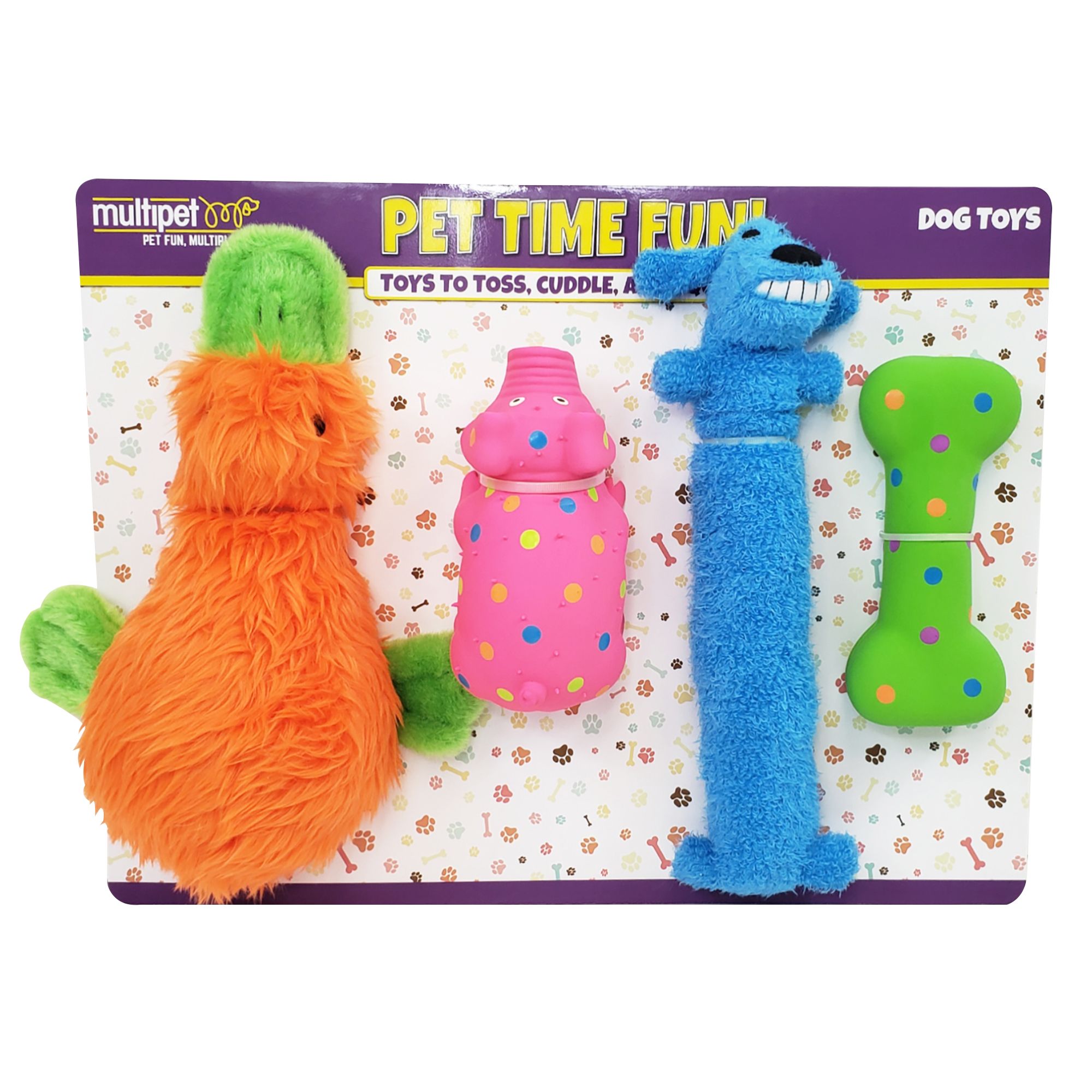 This assorted four pack contains the following: Plush Duckworth - Duckworth is a customer and dog favorite. Pups love playing with, fetching, and cuddling with this friendly duck that squeaks | Latex Pig - Our stuffed latex pig is our best selling latex toy! (Latex contains stuffing) | Plush Loofa - A favorite among dogs everywhere, our Loofa Dog is the best toy for fetching, chewing, and snuggling. | Latex Bone - This latex bone is the perfect fetch toy! (Latex contains stuffing). Each toy has its own special material, color and unique sound that will keep your dog entertained for hours. To make things even better, these toys are tested and proven to be our top selling and most recognizable toys year over year! Whether they prefer to play or snuggle with these toys, your four legged best friend could not have a better assortment to choose from!