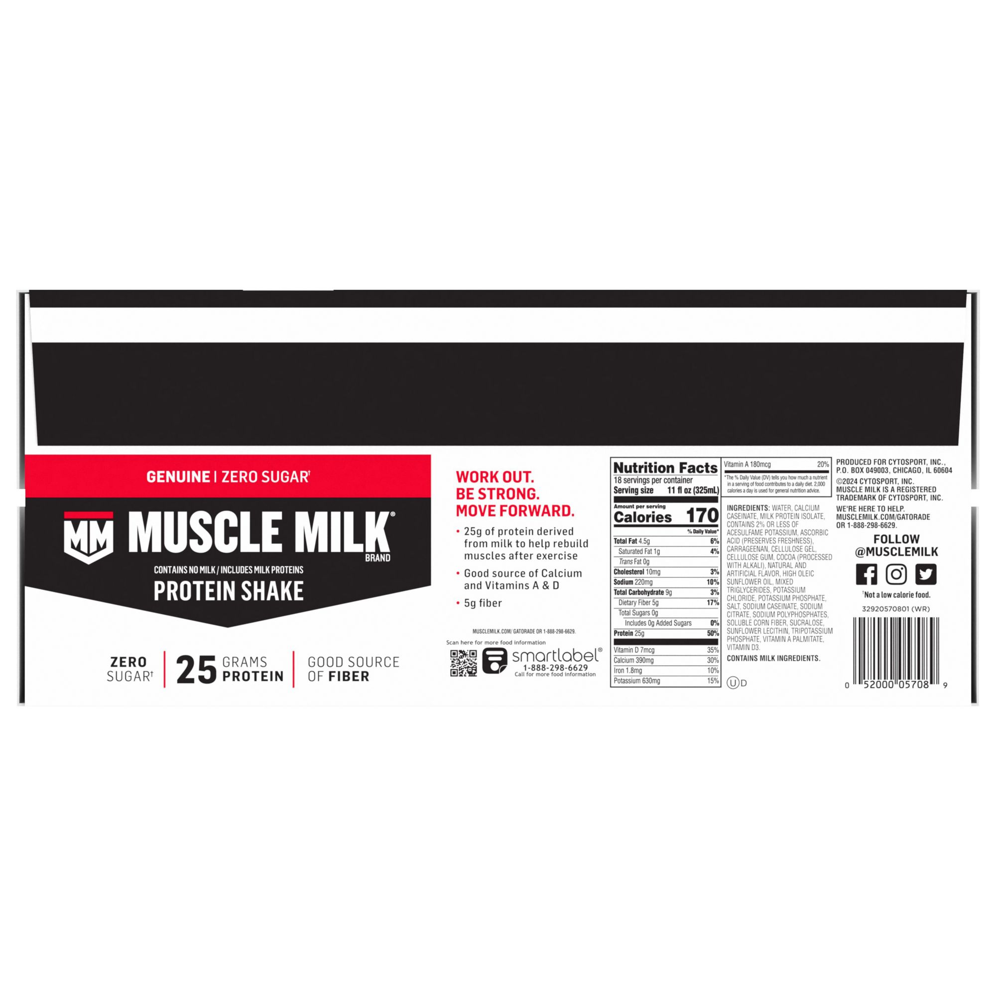 Based on 1 shake, Muscle Milk Genuine Protein Shakes contain 25g protein, zero sugar, 5g fiber, and a good source of Calcium and Vitamins A, C & D