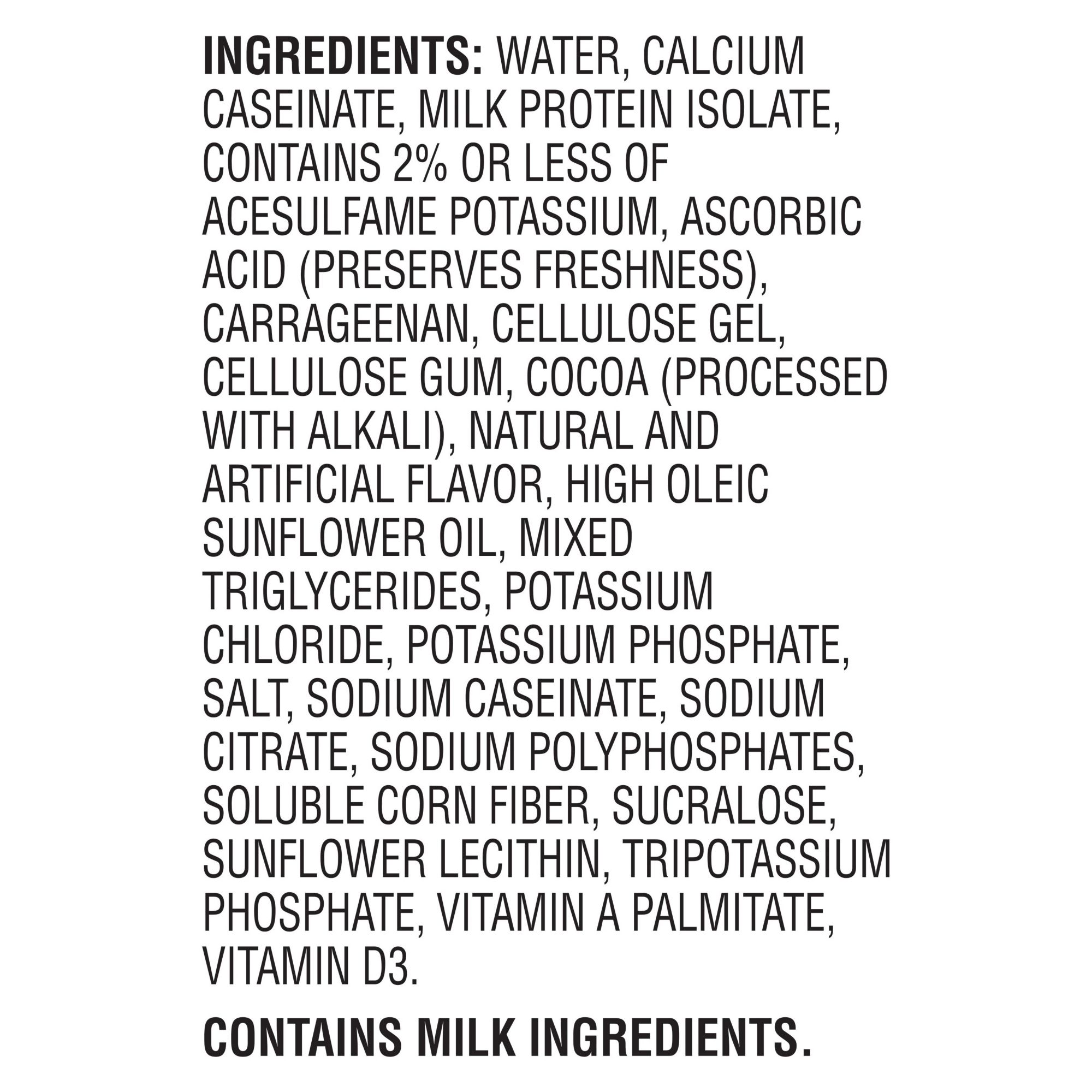 Ingredients: Water, Calcium Caseinate, Milk Protein Isolate. Contains 2% Or Less Of: Acesulfame Potassium, Ascorbic Acid (Preserves Freshness), Carrageenan, Cellulose Gel, Cellulose Gum, Cocoa (Processed With Alkali), Natural And Artificial Flavor, High Oleic Sunflower Oil, Mixed Triglycerides, Potassium Chloride, Potassium Phosphate, Salt, Sodium Caseinate, Sodium Citrate, Sodium Polyphosphates, Soluble Corn Fiber, Sucralose, Sunflower Lecithin, Tripotassium Phosphate, Vitamin A Palmitate, Vitamin D3. Contains Milk.