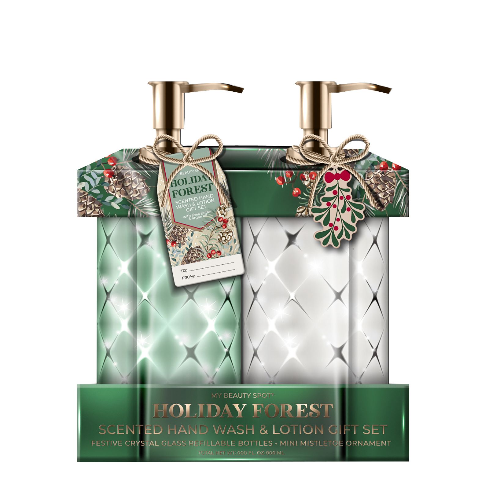 My Beauty Spot Hand Wash & Lotion Gift Set is the perfect gift for the season for any festive occasion. Each set comes with a 16.9 oz. hand wash and a 16.9 oz. lotion. Set has a "To & From" greeting card, along with a mini ornament charm. These bottles are glass and are reusable. The scents the product comes in are: Peppermint Cream, Silver Snow, and Holiday Forest.