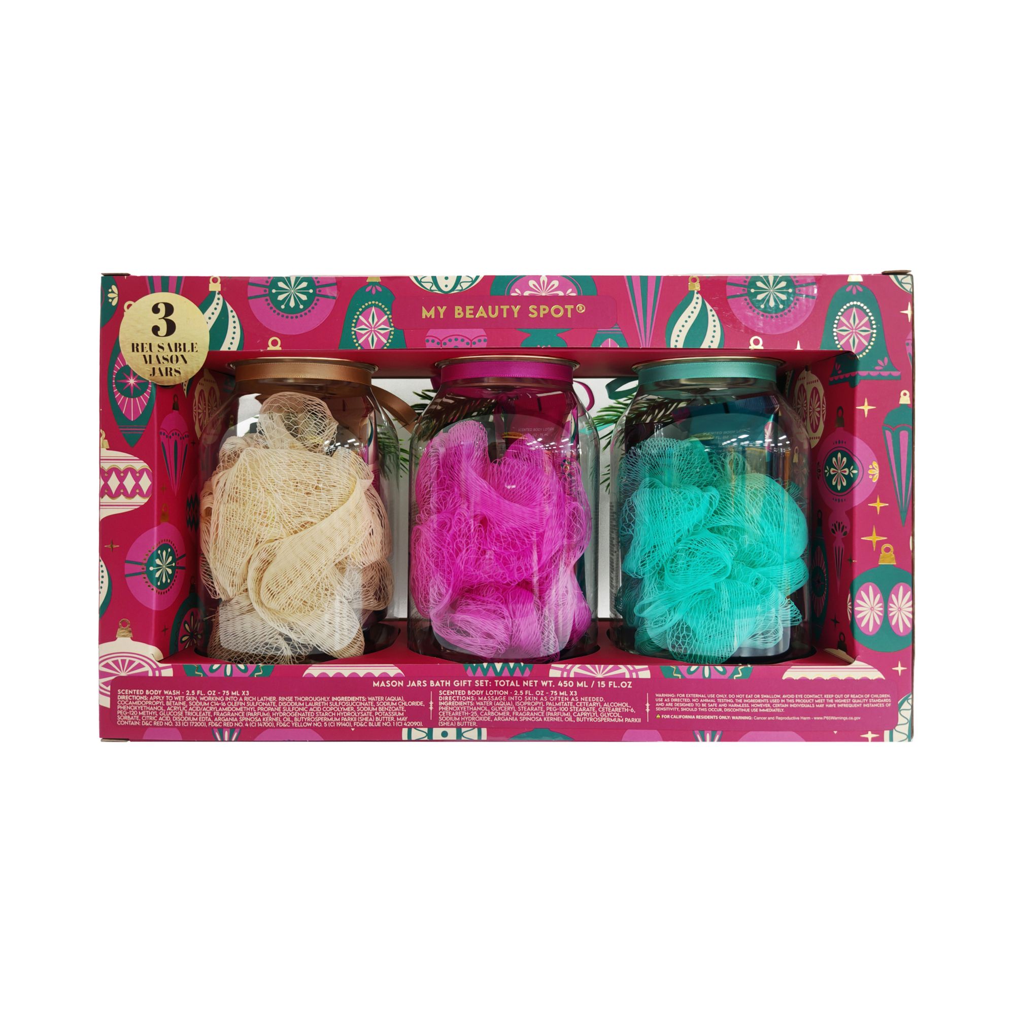 Includes reusable mason jar, body lotion, body wash, and a shower pouf