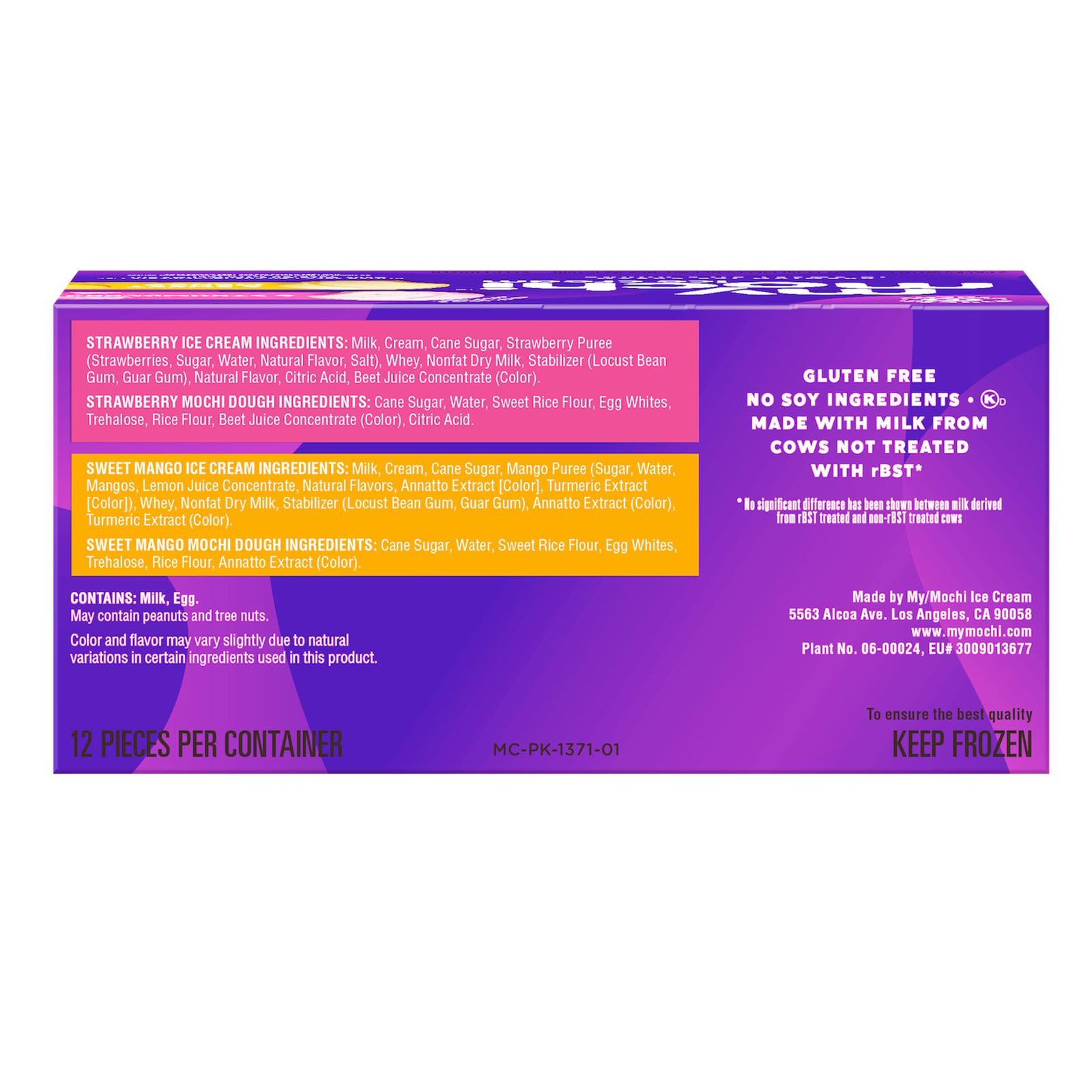 Strawberry Ice Cream Ingredients: Milk, Cream, Cane Sugar, Strawberry Puree (Strawberries, Sugar, Water, Natural Flavor, Salt), Whey, Nonfat Dry Milk, Stabilizer (Locust Bean Gum, Guar Gum), Natural Flavor, Citric Acid, Beet Juice Concentrate (Color). Strawberry Mochi Dough Ingredients: Cane Sugar, Water, Sweet Rice Flour, Egg Whites, Trehalose, Rice Flour, Beet Juice Concentrate (Color), Citric Acid. Sweet Mango Ice Cream Ingredients: Milk, Cream, Cane Sugar, Mango Puree (Sugar, Water, Mangos, Lemon Juice Concentrate, Natural Flavors, Annatto Extract [Color], Turmeric Extract [Color]), Whey, Nonfat Dry Milk, Stabilizer (Locust Bean Gum, Guar Gum), Annatto Extract (Color), Turmeric Extract (Color). Sweet Mango Mochi Dough Ingredients: Cane Sugar, Water, Sweet Rice Flour, Egg Whites, Trehalose, Rice Flour, Annatto Extract (Color)