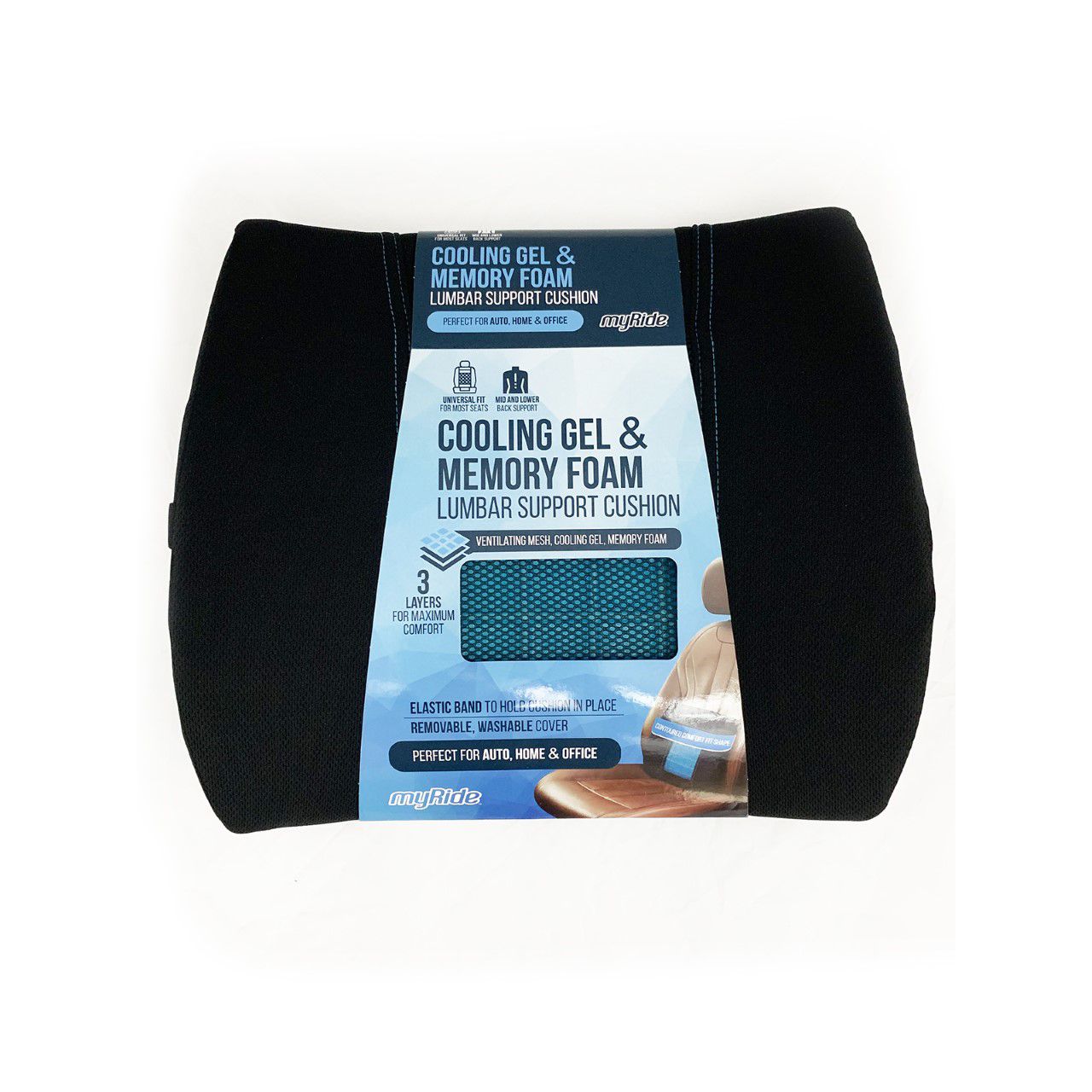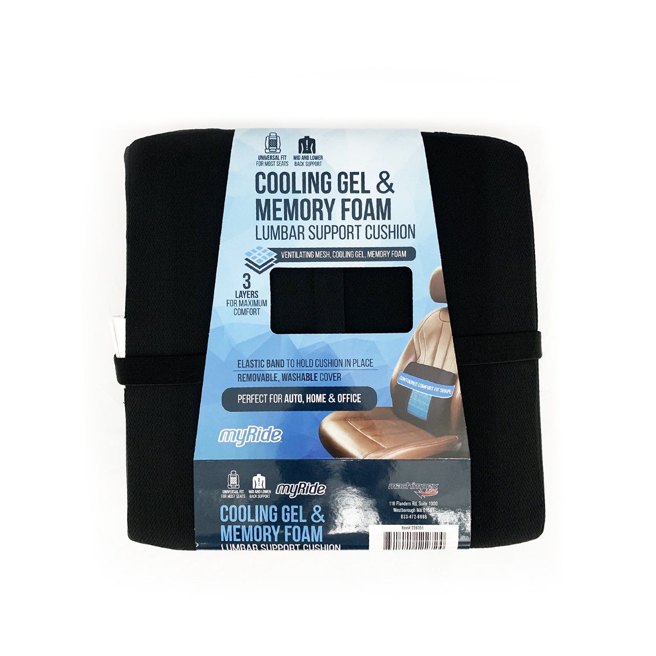 The MyRide Lumbar Seat Cushion with Cooling Gel and Memory Foam is ergonomically designed to provide lower back support and is perfect for auto, home or office use. Adjustable straps allow for flexibility in positioning to alleviate pressure on the lower back while the cooling gel and memory form provide comfort and support. The cushion's protective covering may be unzipped and machine washed as needed.