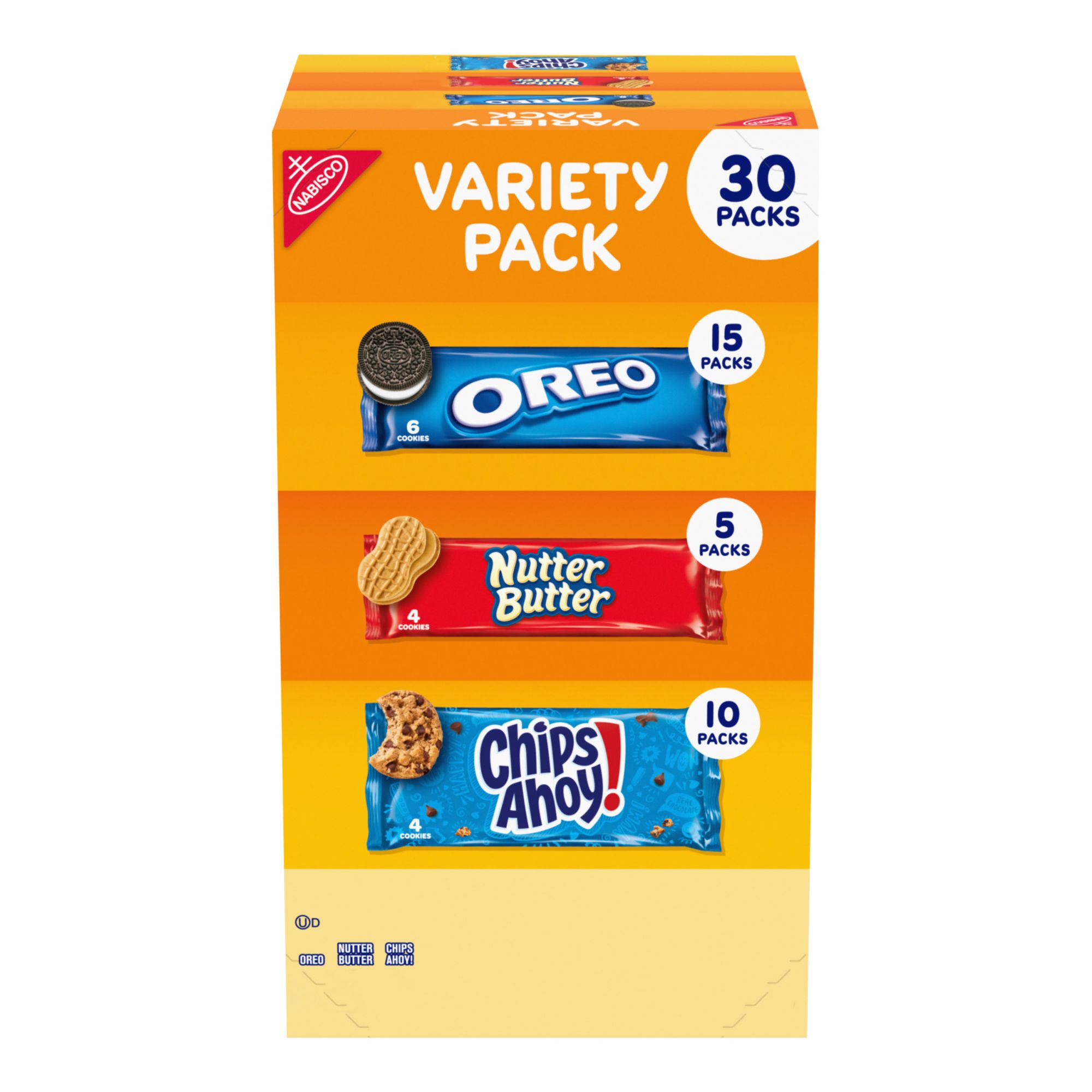 Includes One Nabisco Cookie Variety Pack with 30 total snack packs, including 15 Oreo Chocolate Sandwich Cookies, 5 Nutter Butter Peanut Butter Cookies and 10 Chips Ahoy! Chocolate Chip Cookies (packaging may vary)