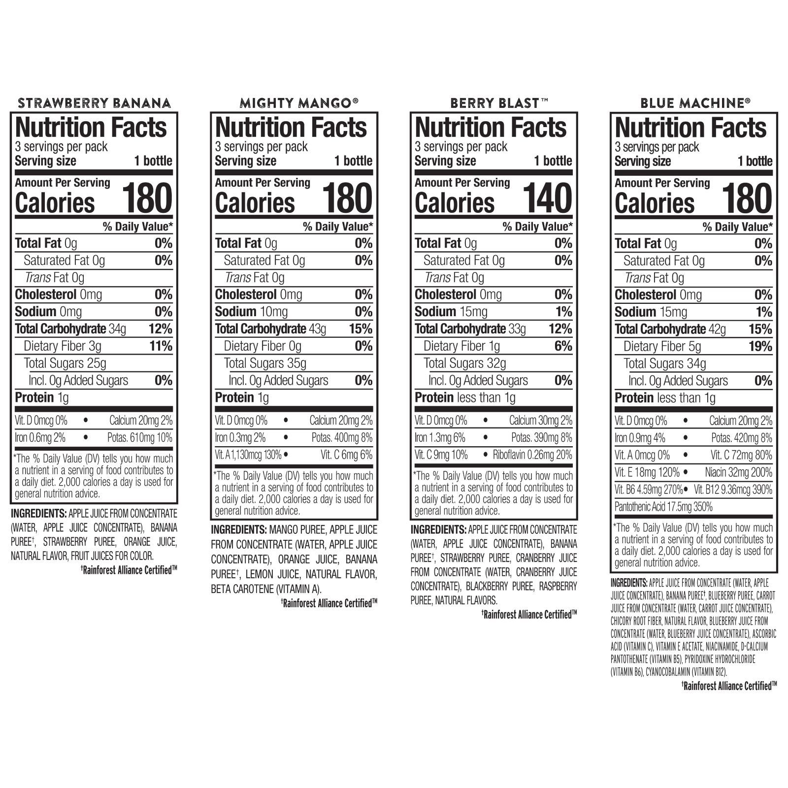 Ingredients: Pina Colada Machine: Pineapple Juice, Apple Juice From Concentrate (Water, Apple Juice Concentrate), Banana Puree, Coconut Milk, (Water, Coconut Cream), Orange Juice, Inulin, Lemon Juice, Natural Flavor, Ascorbic Acid (Vitamin C), Vitamin E Acetate, Niacinamid, D-calcium Pantothenate (Vitamin B5), Pyridoxine Hydrochloride (Vitamin B6), Cyancobalamin (Vitamin B12), Contains Coconut. Strawberry Banana Machine: Apple Juice From Concentrate (Water, Apple Juice Concentrate), Banana Puree, Strawberry Puree, Inulin, Orange Juice, Fruit Juice For Color, Natural Flavor, Ascorbic Acid (Vitamin C), Vitamin E Acetate, Niacinamide, D-calcium Pantothenate (Vitamin B5), Pyridoxine Hydrochloride (Vitamin B6), Cyanocobalamin (Vitamin B12). Blue Machine: Apple Juice From Concentrate (Water, Apple Juice Concentrate), Banana Puree, Blueberry Puree, Inulin, Natural Flavor, Fruit And Vegetable Juice For Color, Ascorbic Acid (Vitamin C), Vitamin E Acetate, Niacinamide, D-calcium Pantothenate (Vitamin B5), Pyridoxine Hydrochloride (Vitamin B6), Cyanocobalamin (Vitamin B12).mighty Mango Machine: Mango Puree, Apple Juice From Concentrate (Water, Apple Juice Concentrate), Banana Puree, Lemon Juice, Inulin, Natural Flavor, Ascorbic Acid (Vitamin C), Beta Carotine, Vitamin E Acetate, Niacinamide, D-calcium Pantothenate (Vitamin B5), Pyridoxine Hydrochloride (Vitamin B6), Cyanocobalamin (Vitamin B12).