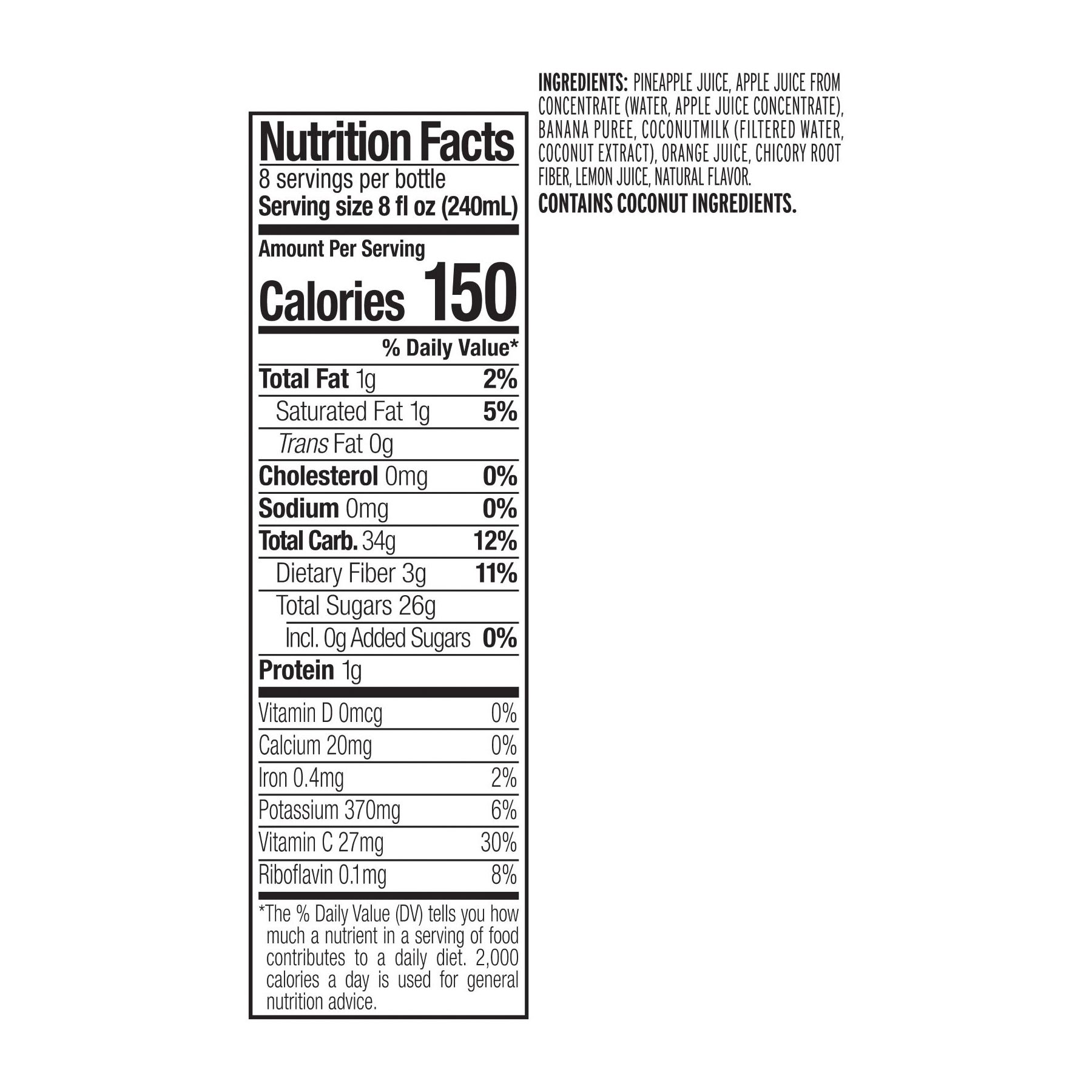 Ingredients Pineapple Juice, Apple Juice From Concentrate (Water, Apple Juice Concentrate), Banana Puree, Coconut Milk (Filtered Water, Coconut Extract), Orange Juice, Chicory Root Fiber, Lemon Juice, Flavor. Contains Coconut Ingredients.