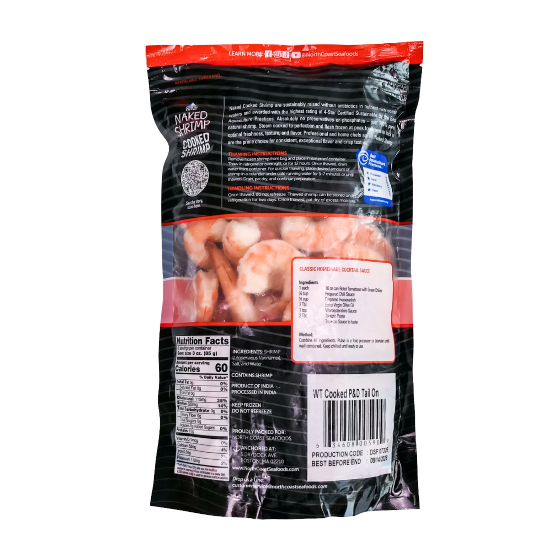 Naked Cooked Shrimp are sustainably raised without antibiotics in nutrient-rich ocean waters and awarded with the highest rating of 4-Star Certified Sustainable by the Best Aquaculture Practices. Absolutely no artificial preservatives or phosphates- just 100% pure, natural shrimp. Steam cooked to perfection and flash frozen at peak freshness to lock in optimal taste, texture and flavor.
