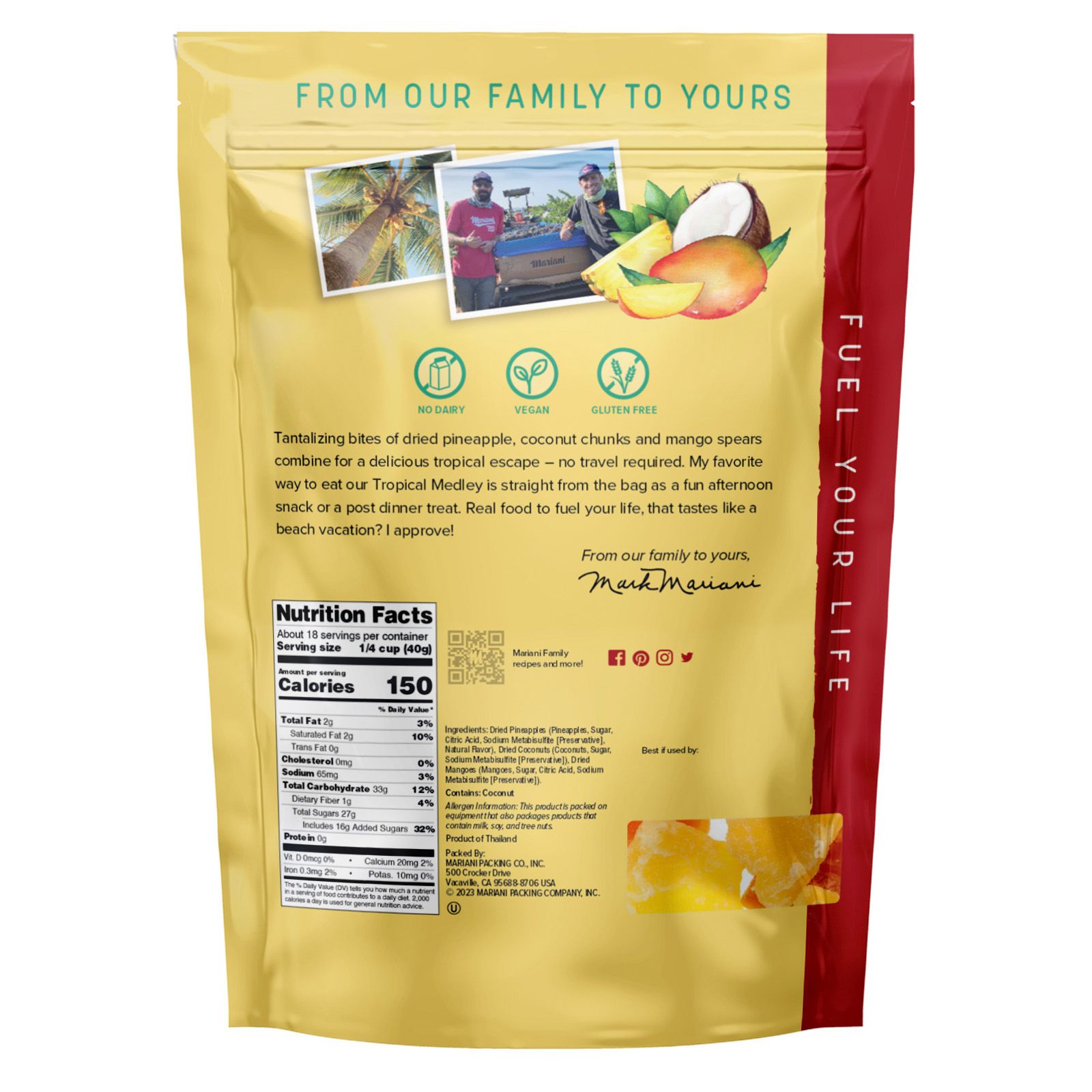 Tantalizing bites of dried pineapple, coconut chunks and mango spears combine for a delicious tropical escape - no travel required. A favorite way to eat this Tropical Medley is straight from the bag as a fun afternoon snack or a post dinner treat. With this medley being vegan and gluten free, you can trust that this is real food to fuel your life, that happens to taste like a beach vacation.
