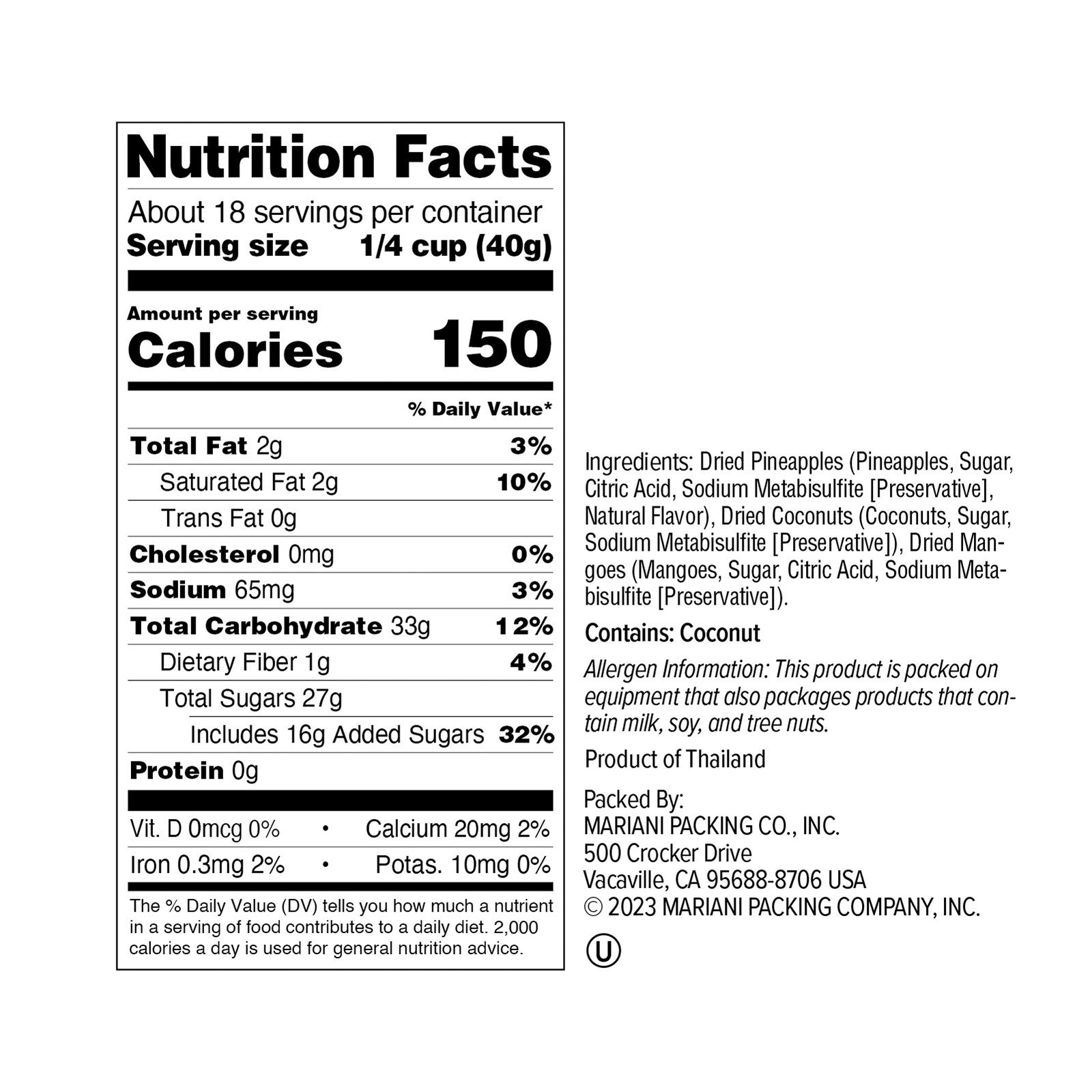 Ingredients: Dried Pineapples (Pineapples, Sugar, Citric Acid, Sodium Metabisulfite [Preservative], Natural Flavor), Dried Coconuts (Coconuts, Sugar, Sodium Metabisulfite [Preservative]), Dried Mangoes (Mangoes, Sugar, Citric Acid, Sodium Metabisulfite [Preservative]).