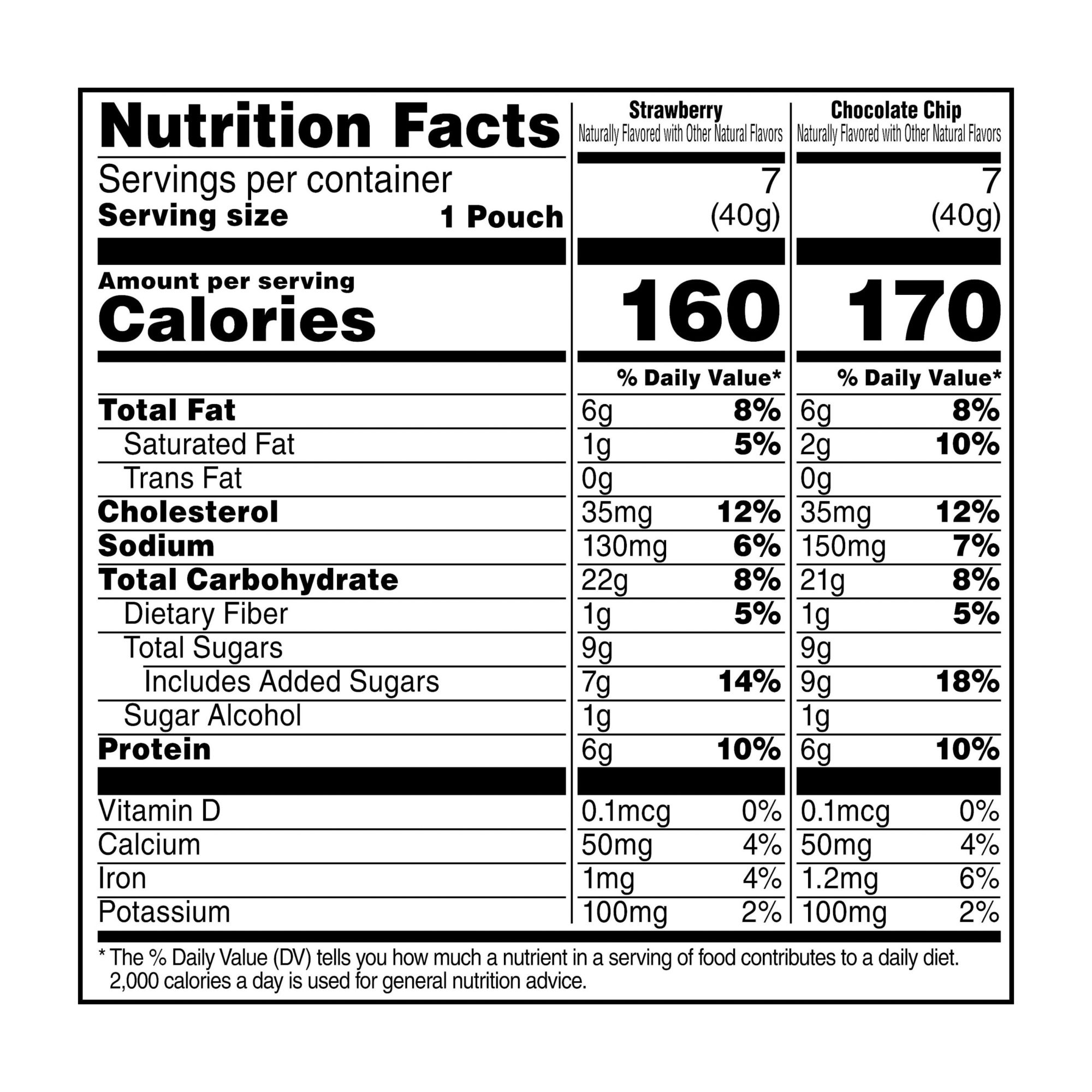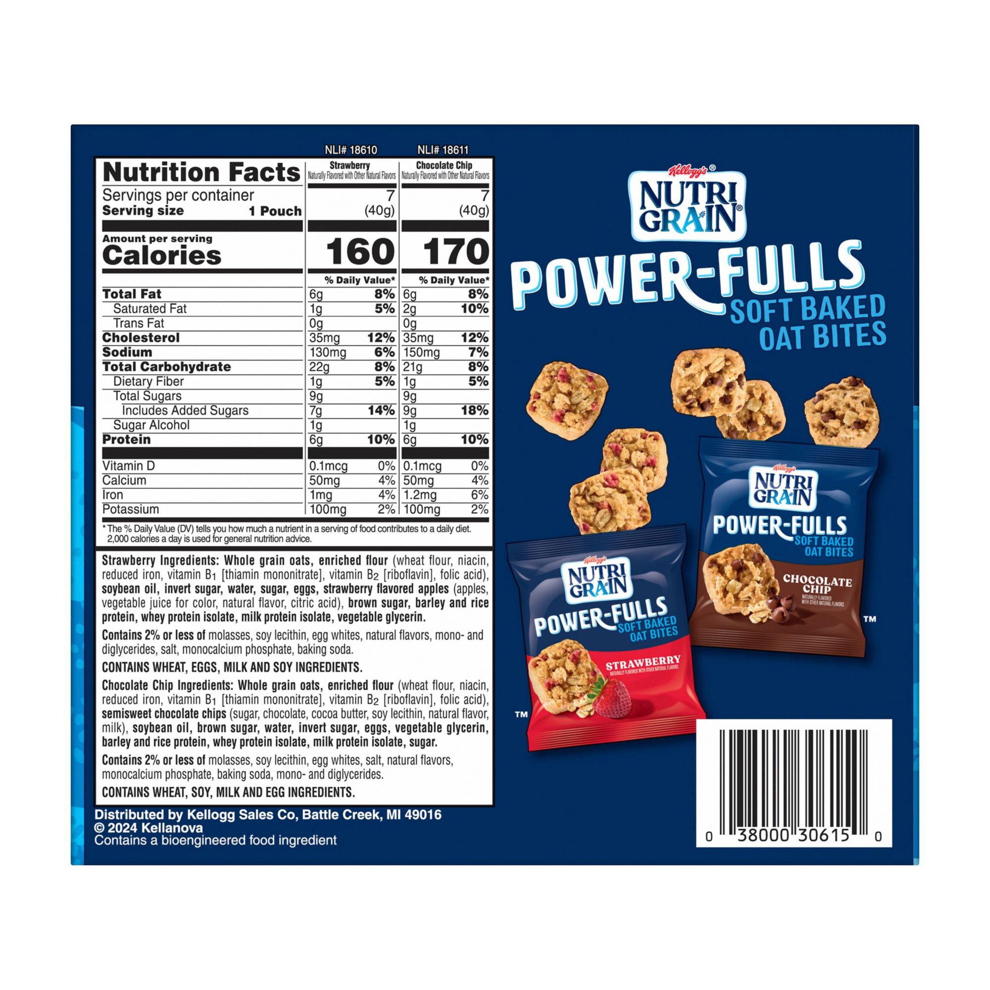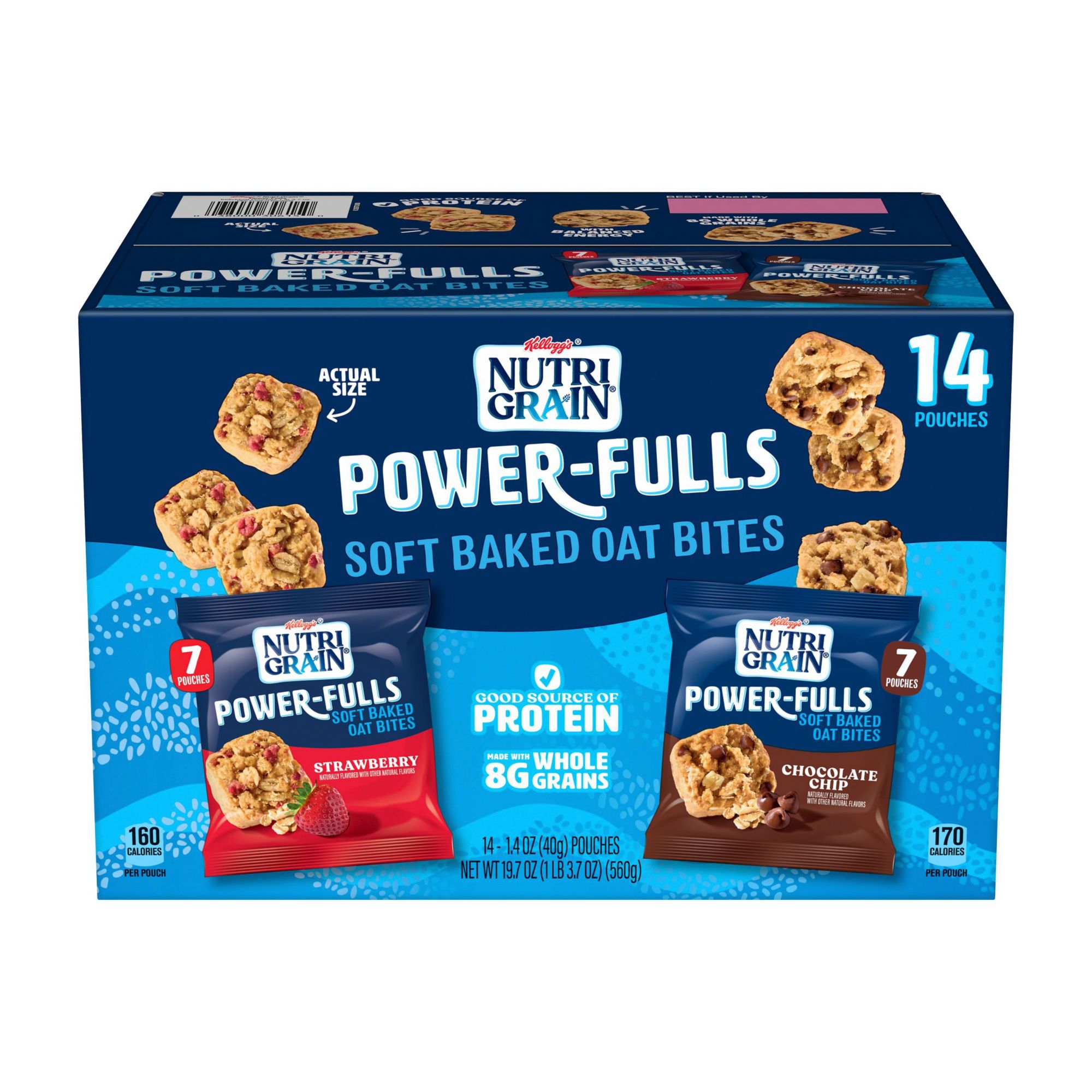 Come prepared for busy moments with Nutri-Grain Power-Fulls soft baked oat bites. Discover a delicious protein snack that helps parents and kids alike power through one activity to the next. This variety pack includes both Chocolate Chip and Strawberry flavors. These soft baked oat bites are a great way to take the edge off hunger. Each serving contains a good source of protein (10% daily value) to provide balanced energy; Every bite is packed with real chocolate chips or strawberry flavor, and large oat pieces for a yummy snack that the whole family will love. These delightfully chewy and light snacks are made with 8g of whole grains per serving. With no prep, enjoy them straight out of the pouch. They're perfectly portable for gym bags or to keep at work for a convenient protein boost. Kids will love them at lunch, before practice, or as an afterschool snack. Nutri-Grain Power-Fulls soft baked oat bites are not only delicious, they're also a great choice for a protein treat.