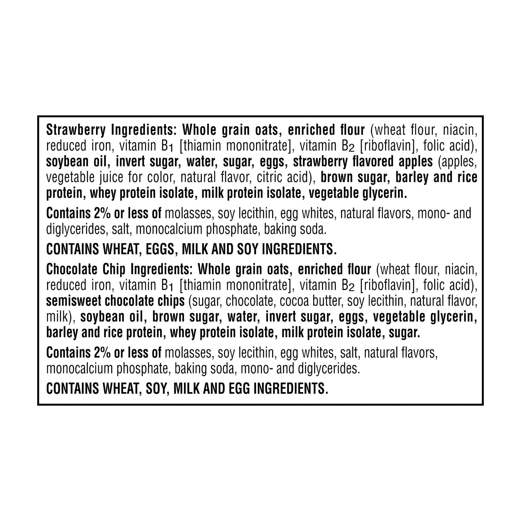 Ingredients: Whole Grain Oats, Enriched Flour (Wheat Flour, Niacin, Reduced Iron, Vitamin B1 [Thiamin Mononitrate], Vitamin B2 [Riboflavin], Folic Acid), Semisweet Chocolate Chips (Sugar, Chocolate, Cocoa Butter, Soy Lecithin, Natural Flavor, Milk), Soybean Oil, Brown Sugar, Water, Invert Sugar, Eggs, Vegetable Glycerin, Barley And Rice Protein, Whey Protein Isolate, Milk Protein Isolate, Sugar. Contains 2% Or Less Of Molasses, Soy Lecithin, Egg Whites, Salt, Natural Flavors, Monocalcium Phosphate, Baking Soda, Mono- And Diglycerides. Ingredients: Whole Grain Oats, Enriched Flour (Wheat Flour, Niacin, Reduced Iron, Vitamin B1 [Thiamin Mononitrate], Vitamin B2 [Riboflavin], Folic Acid), Soybean Oil, Invert Sugar, Water, Sugar, Eggs, Strawberry Flavored Apples (Apples, Vegetable Juice For Color, Natural Flavor, Citric Acid), Brown Sugar, Barley And Rice Protein, Whey Protein Isolate, Milk Protein Isolate, Vegetable Glycerin. Contains 2% Or Less Of Molasses, Soy Lecithin, Egg Whites, Natural Flavors, Mono- And Diglycerides, Salt, Monocalcium Phosphate, Baking Soda.