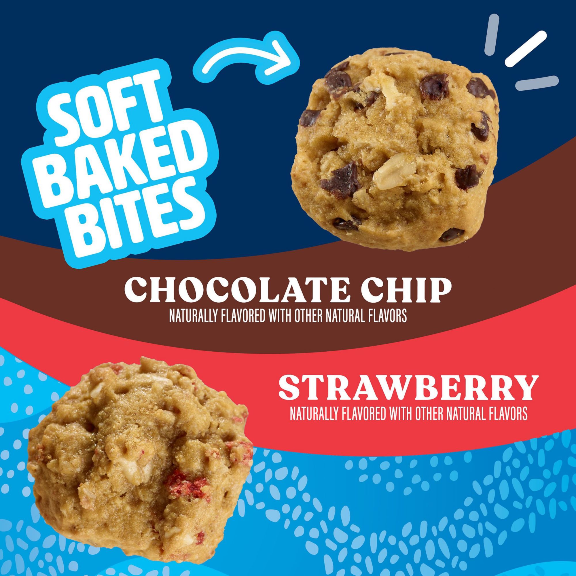 Chewy, soft, and deliciously munchable protein snack; Soft baked oat bites made with whole grain oats, sweet chocolate chips or yummy strawberry flavored fruit pieces