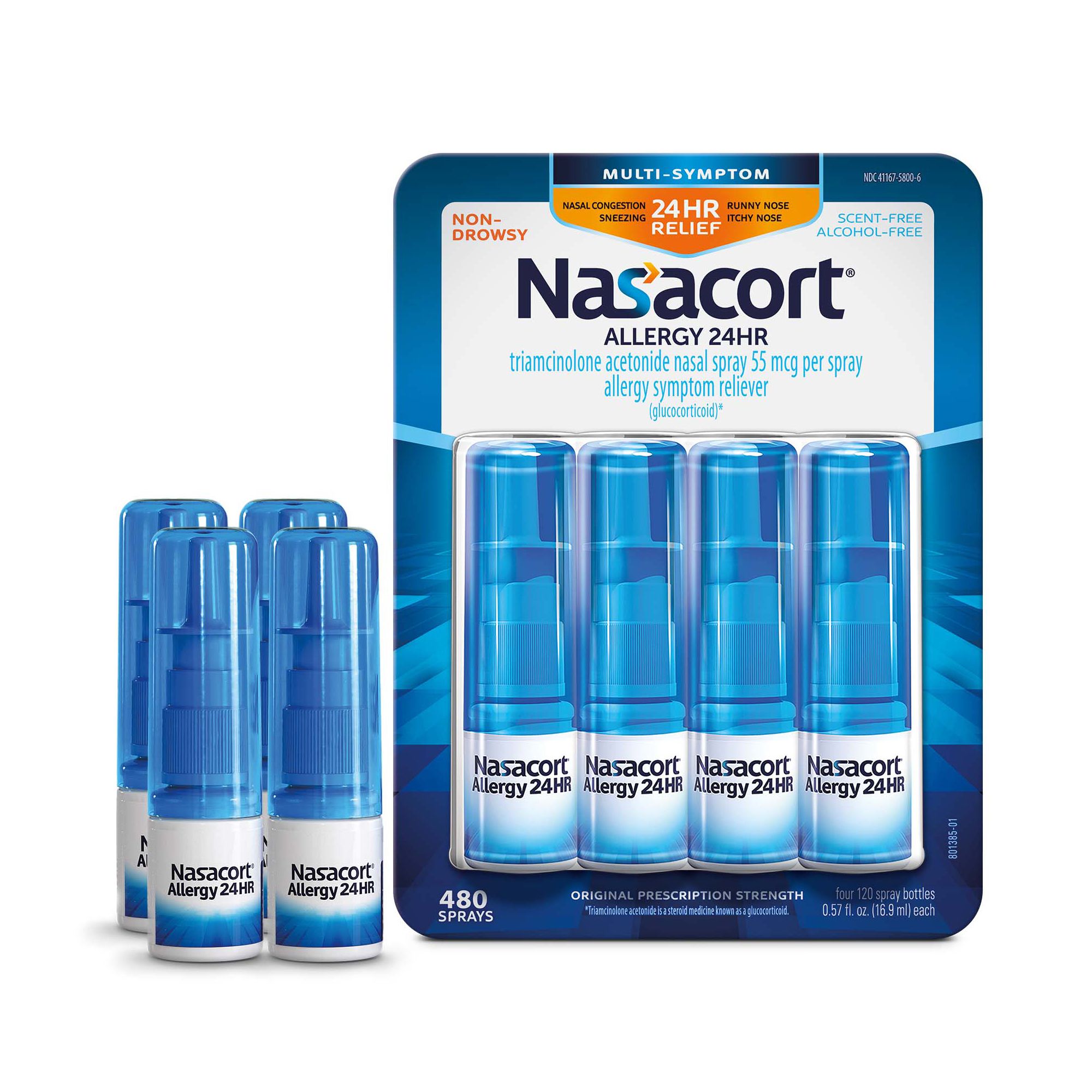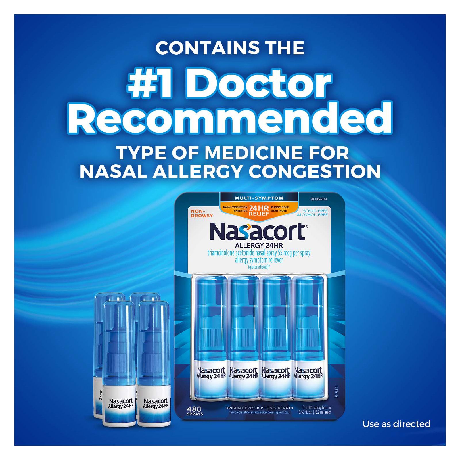 The only OTC brand, Nasacort Allergy 24HR provides 24-hour relief from nasal congestion, sneezing, runny nose and itchy nose. It uses intranasal steroids (INS), the class of drug doctors recommend "first" for their allergy patients. The INS (Corticosteroids) reduce inflammation and histamine production in the nasal passage.
