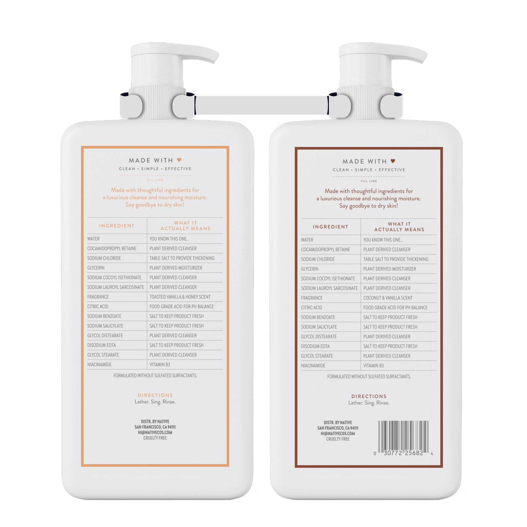 Deeply nourish and hydrate dry skin. Introducing Native's nourishing moisture body wash, a thoughtful blend of ingredients designed to provide the ultimate care. Made with niacinamide and plant-based moisturizers, leaving the skin feeling soft and smooth. Clean and simple formula. Enjoy the "sud-sational" rich lather that comes with all our body washes, along with our formula free from sulfates, parabens, dyes, and petrolatum. Our nourishing moisture body wash is a must-have in the shower and leaves your skin feeling hydrated, without compromising on clean. All day vanilla vibes. Enjoy Native's #1 scent, coconut and vanilla. Now featuring toasted vanilla and honey. Experience a delicious cocktail of coconut, pineapple, citrus, and vanilla. This body wash does not leave any residue on the skin and leaves the skin feeling refreshed. Lovingly made with cleansers derived from plants for gentle moisturization and an incredible showering experience. Twin pack for more hydration. Our body wash gives you a luxurious lather in the shower, and leaves skin feeling soft and hydrated when you step out of it. Our simple formula is thoughtfully made to get you clean. That's why you'll see plant-based cleansers on our label. Refreshingly smooth, tropical scent that is both sweet and sophisticated. Now that's something to froth about.
