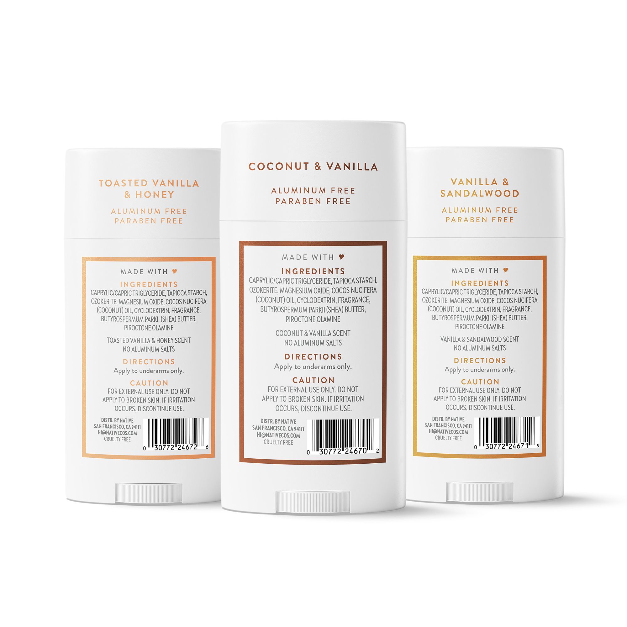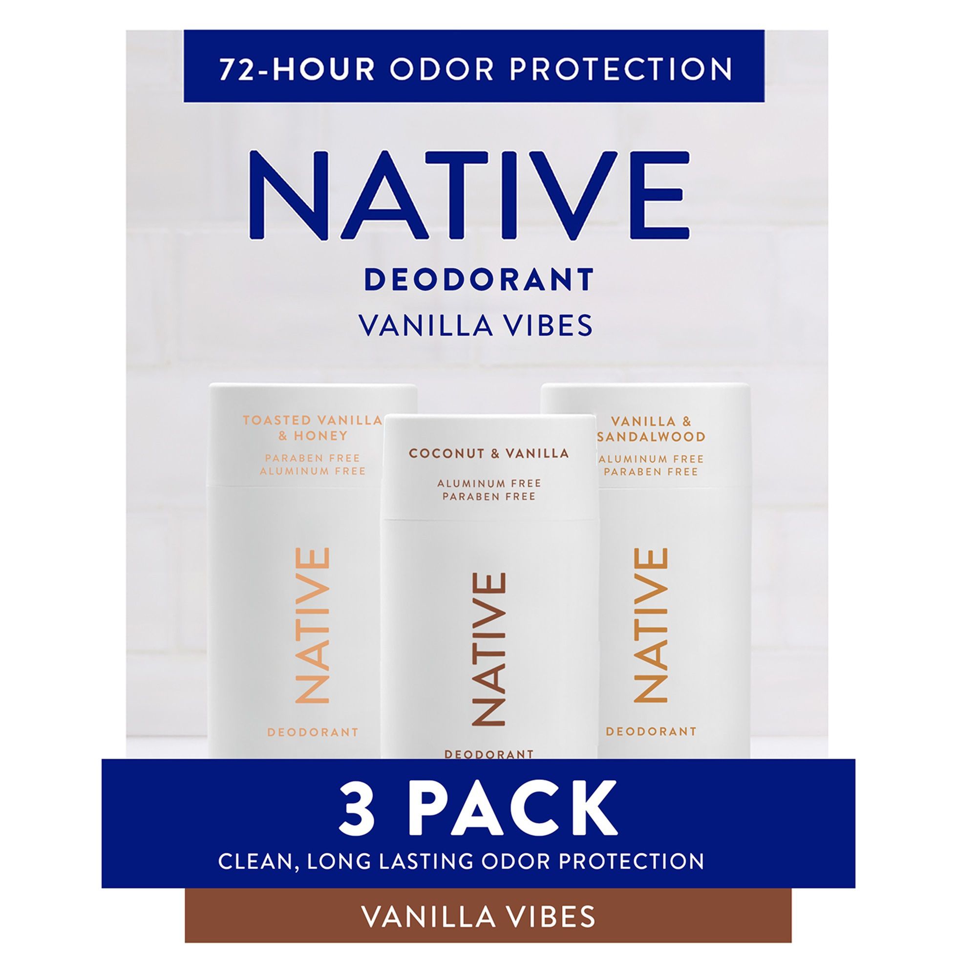 Discover ultimate freshness with our Native Deodorant Vanilla Vibes 3-piece pack, featuring three delightful vanilla scents that elevate your everyday routine. A couple swipes of Native's clean deodorant go a long way, delivering effective odor protection for up to 72 hours. Crafted with care and free from harsh chemicals, these deodorants embrace the power of naturally derived ingredients, ensuring you smell great and feel fresh all day long. Each stick is infused with the warm, comforting essence of vanilla, balanced with variations of bright, fresh, and cozy notes to choose from: Coconut and Vanilla, Vanilla and Sandalwood, and Toasted Vanilla and Honey. Our simple nine-ingredient formula glides smoothly, providing comfortable and effective odor protection that's kind to your skin. Made with skin-loving moisturizers and without baking soda, this deodorant has a soft and smooth glide application that's gentle on your skin. Formulated for men and women, this award-winning deodorant is effective enough to work on pits of all kinds. At Native, we believe in clean ingredients and transparency. Our deodorants are made without aluminum, parabens, or phthalates, so you can indulge in your favorite scents while keeping your body happy. Like all Native products, these deodorants provide a delightful personal care experience that really works. Complete your self-care routine with Native's full range of products, including hair care and body wash. Native: Clean. Simple. Effective.