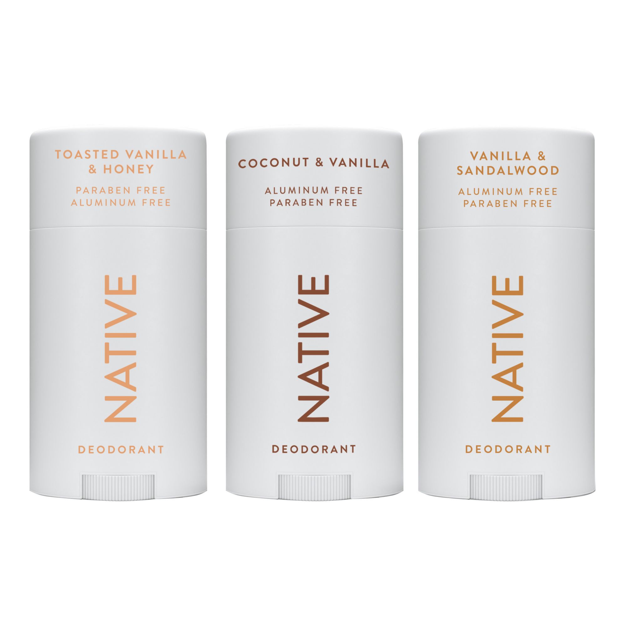 Discover ultimate freshness with our Native Deodorant Vanilla Vibes 3-piece pack, featuring three delightful vanilla scents that elevate your everyday routine. A couple swipes of Native's clean deodorant go a long way, delivering effective odor protection for up to 72 hours. Crafted with care and free from harsh chemicals, these deodorants embrace the power of naturally derived ingredients, ensuring you smell great and feel fresh all day long. Each stick is infused with the warm, comforting essence of vanilla, balanced with variations of bright, fresh, and cozy notes to choose from: Coconut and Vanilla, Vanilla and Sandalwood, and Toasted Vanilla and Honey. Our simple nine-ingredient formula glides smoothly, providing comfortable and effective odor protection that's kind to your skin. Made with skin-loving moisturizers and without baking soda, this deodorant has a soft and smooth glide application that's gentle on your skin. Formulated for men and women, this award-winning deodorant is effective enough to work on pits of all kinds. At Native, we believe in clean ingredients and transparency. Our deodorants are made without aluminum, parabens, or phthalates, so you can indulge in your favorite scents while keeping your body happy. Like all Native products, these deodorants provide a delightful personal care experience that really works. Complete your self-care routine with Native's full range of products, including hair care and body wash. Native: Clean. Simple. Effective.