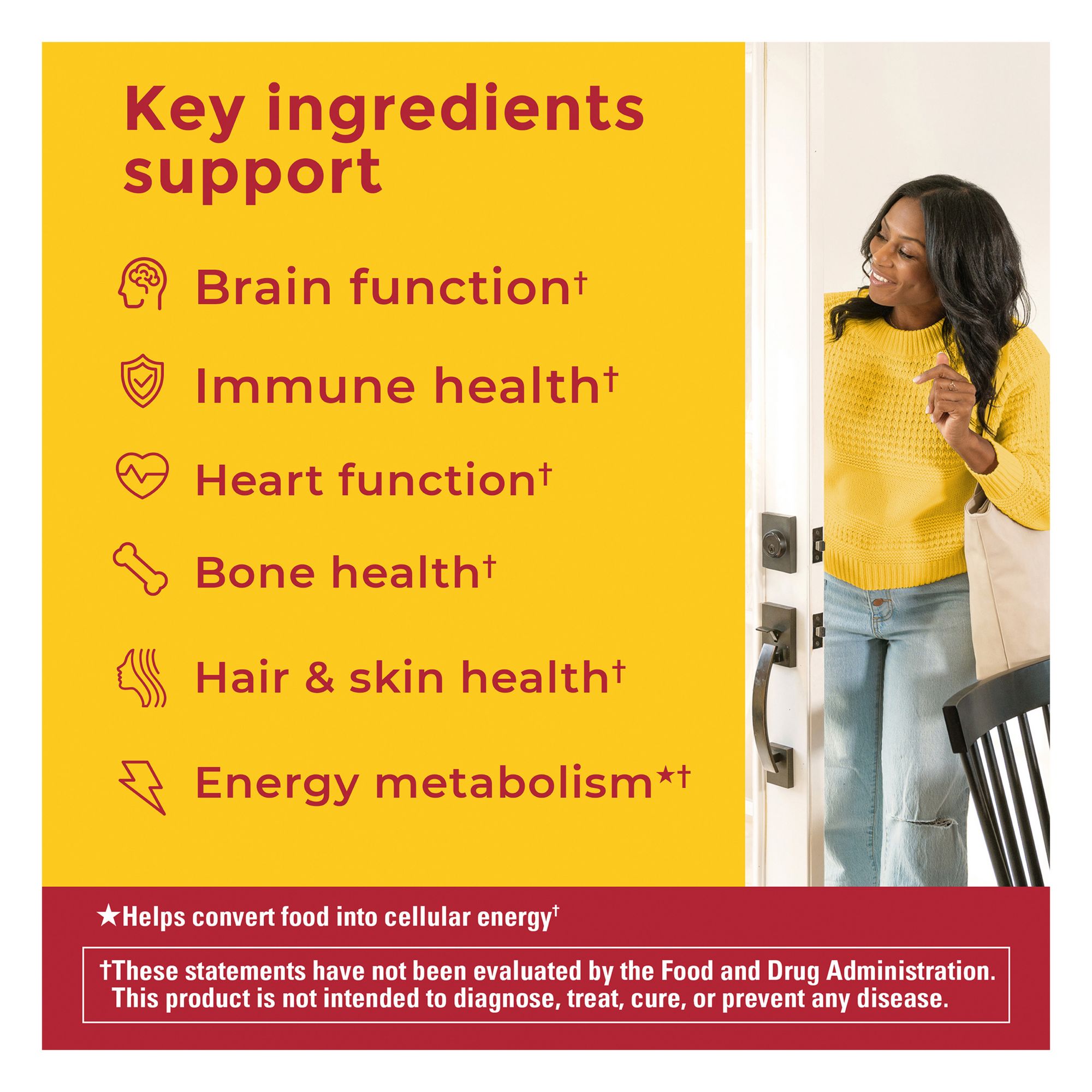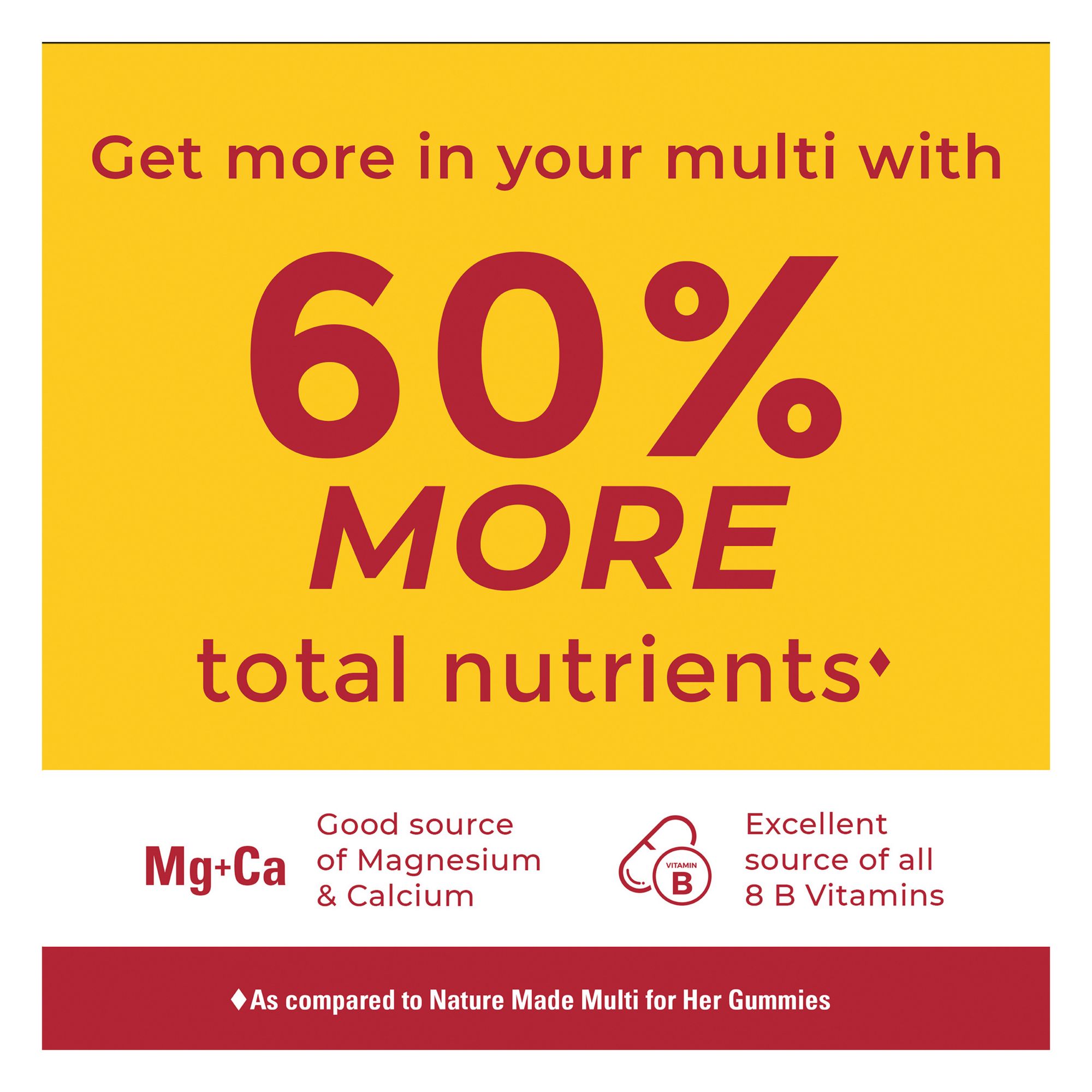 *As compared to Nature Made Multi for Her Gummies. **Helps convert food into cellular energy. These statements have not been evaluated by the Food and Drug Administration. This product is not intended to diagnose, treat, cure, or prevent any disease.