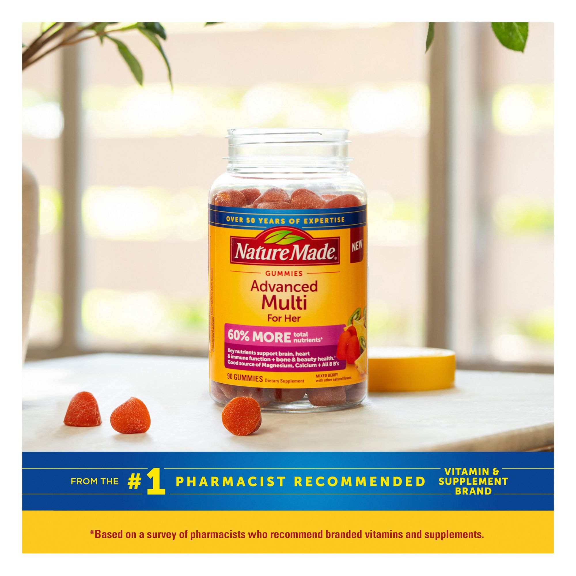 Nature Made Advanced Multi for Her Gummies provide 20 key nutrients for daily nutritional support. It’s a multivitamin for women providing 60% more total nutrients* in tasty gummies plus a good source of Magnesium Citrate and Calcium and an excellent source of all 8 B Vitamins. This women's multivitamin provides nutrients to support brain, heart and immune function, bone and beauty health, and energy metabolism**. Biotin supports healthy hair and skin. These daily vitamin gummies are gluten free with no artificial flavors, no high fructose corn syrup, and no synthetic dyes – color derived from natural source. These vitamins for women are in a tasty tropical fruit with other natural flavors. Adults, chew 3 gummies daily. Start your day with women's vitamins from Nature Made.