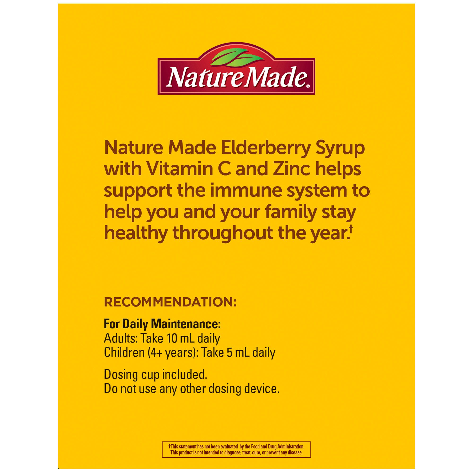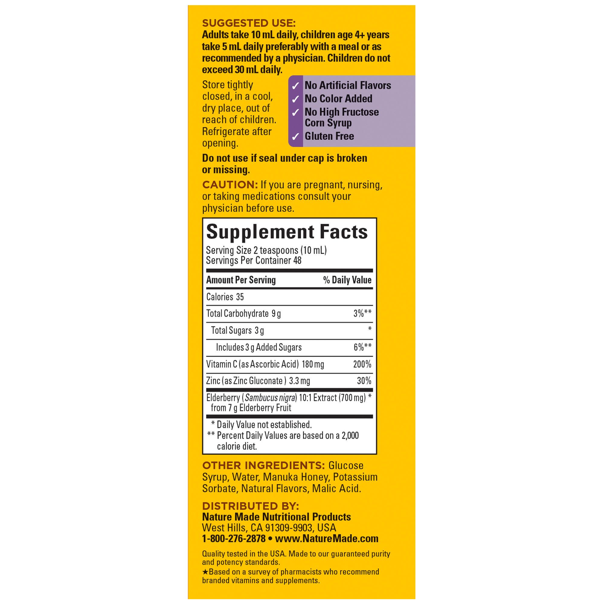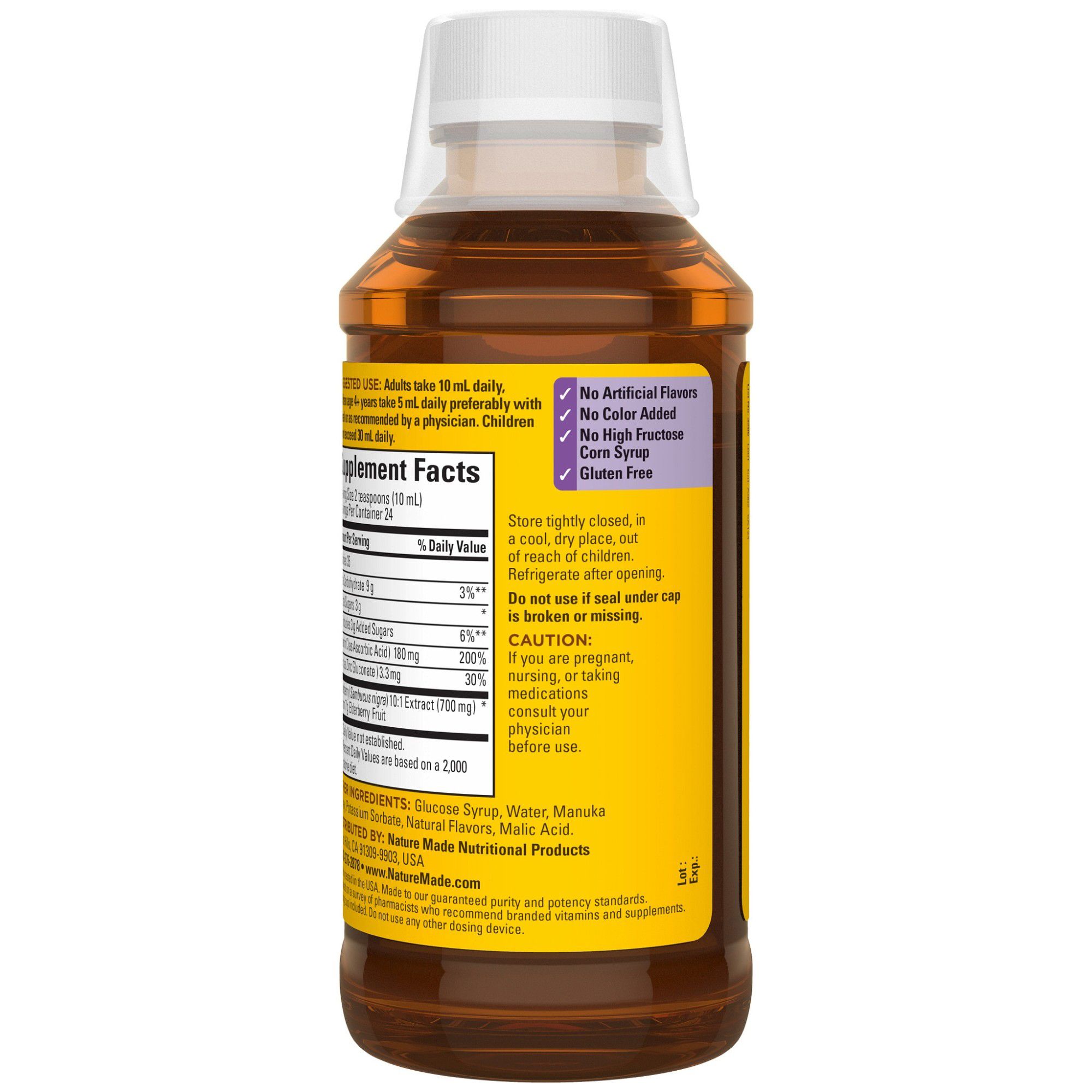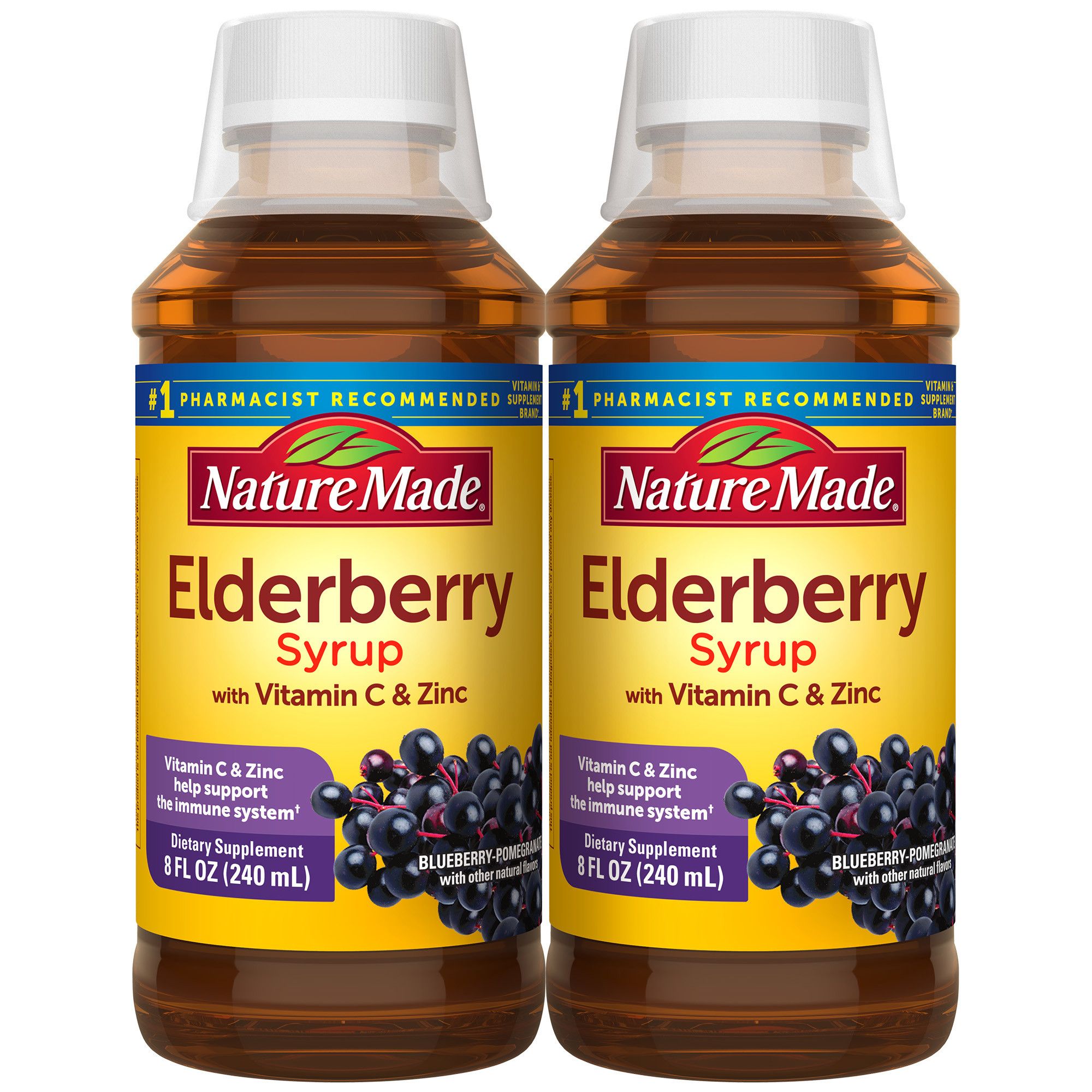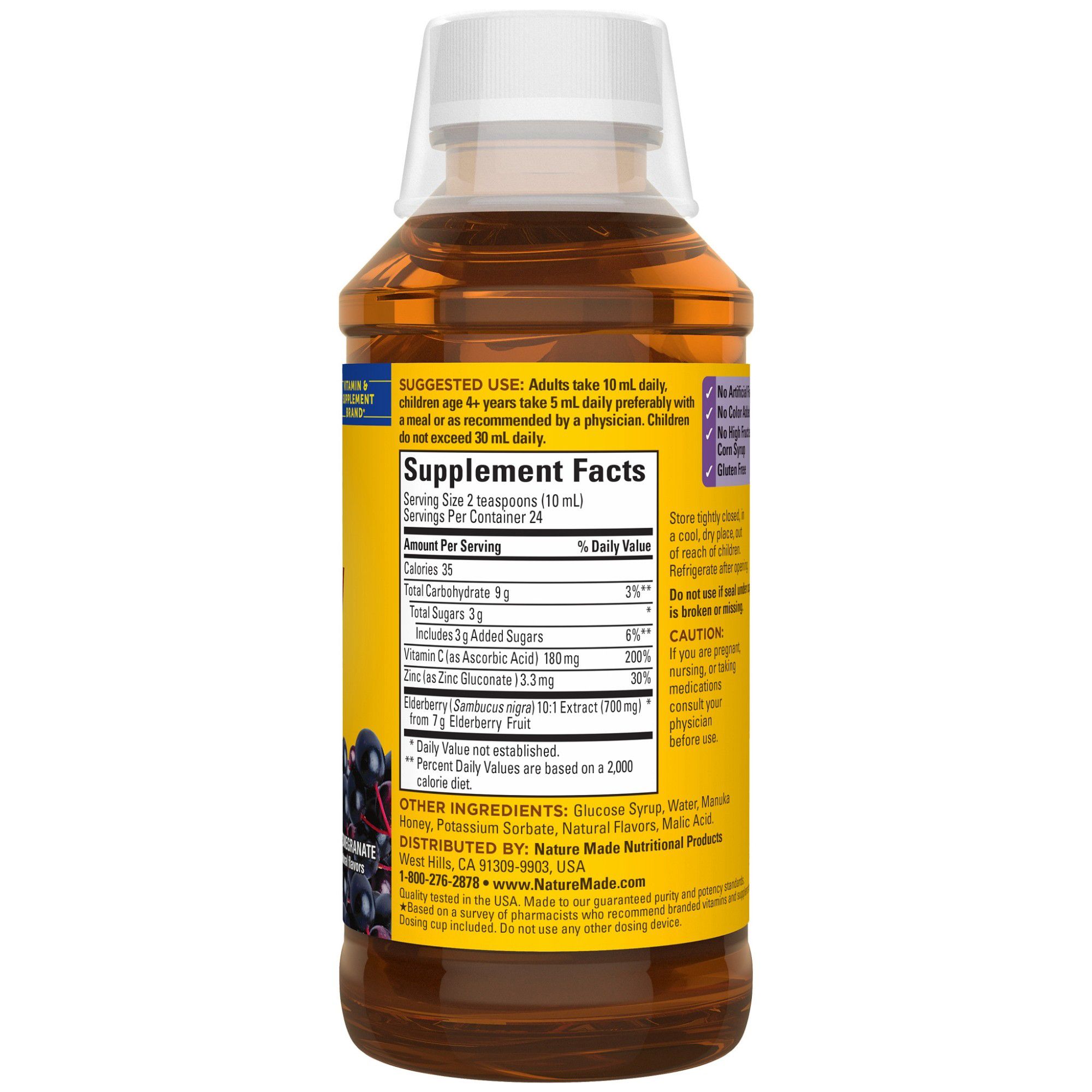 Give your body a little extra immune support with just two delicious teaspoons (10mL) of this higher dosage elderberry syrup with Vitamin C and Zinc.†* Nature Made Elderberry Syrup with Vitamin C and Zinc contains 3.8g of elderberry fruit extract, plus 180mg of Vitamin C and 3.3mg of Zinc—two key immune support nutrients per serving.† Vitamin C is a well-known antioxidant and helps support the immune system by neutralizing damaging free radicals.† Zinc is a key immune support nutrient, as the immune system relies on Zinc for normal development and function of immune cells.† This delicious elderberry syrup contains 3.8g of elderberry fruit extract along with 180mg of Vitamin C, and 3.3mg of Zinc per serving to help support the immune system.† Comes in tasty blueberry pomegranate with other natural flavors, with manuka honey for taste—plus it’s suitable for vegetarians! This Elderberry Syrup with Vitamin C and Zinc is a great alternative to swallowing pills. Treat yourself to two teaspoons of delicious immune support today, with Nature Made Elderberry Syrup with Vitamin C and Zinc.†