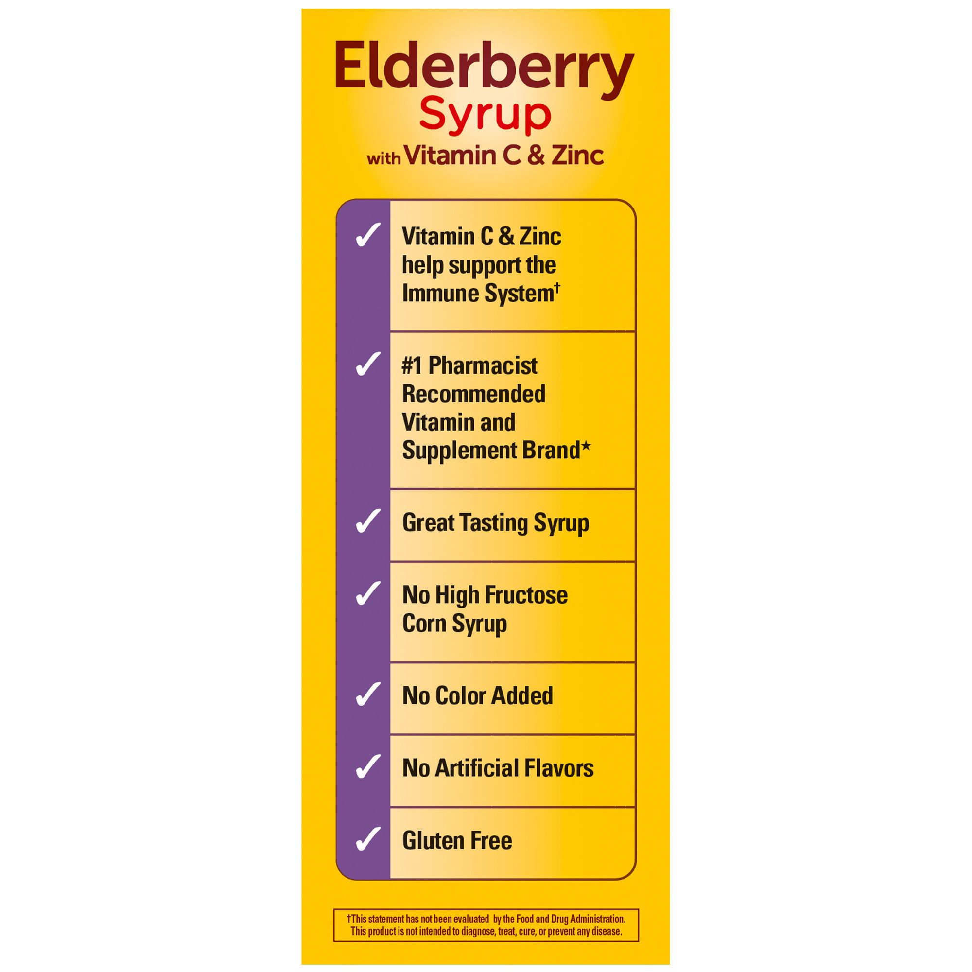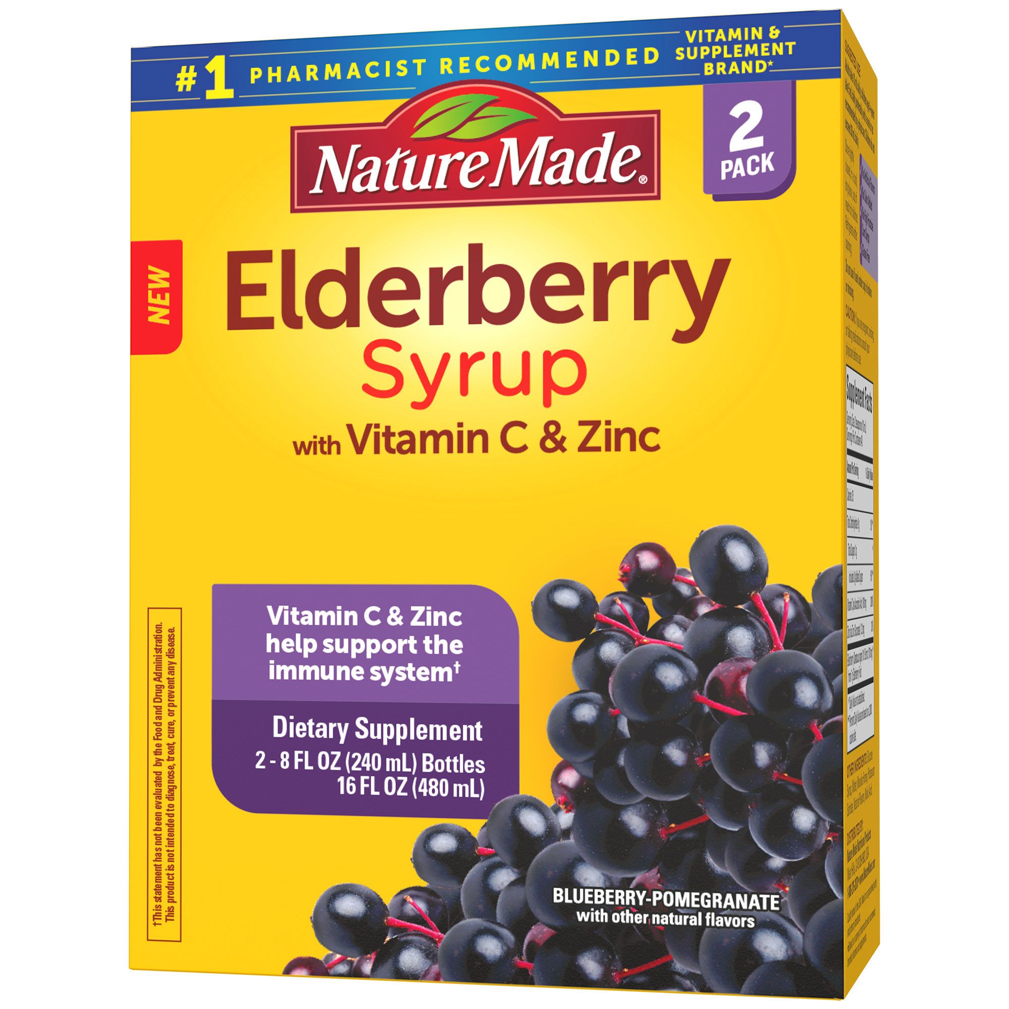 Delicious black Elderberry syrup with 700mg Elderberry fruit extract. 180mg Vitamin C and 3.3mg Zinc per serving for immune support help.† Blueberry Pomegranate with other natural fruit flavors, and a splash of manuka honey for taste. 48 convenient servings of immune support for the whole family.† 8 oz bottle, 2 bottles per pack. Adults take 2 teaspoons (10mL) daily. Children 4+ years take 5mL daily with a meal.** No artificial flavors, no color added, no high fructose corn syrup, gluten free, no dairy. Suitable for vegetarians. #1 Pharmacist Recommended Vitamin & Supplement Brand.*