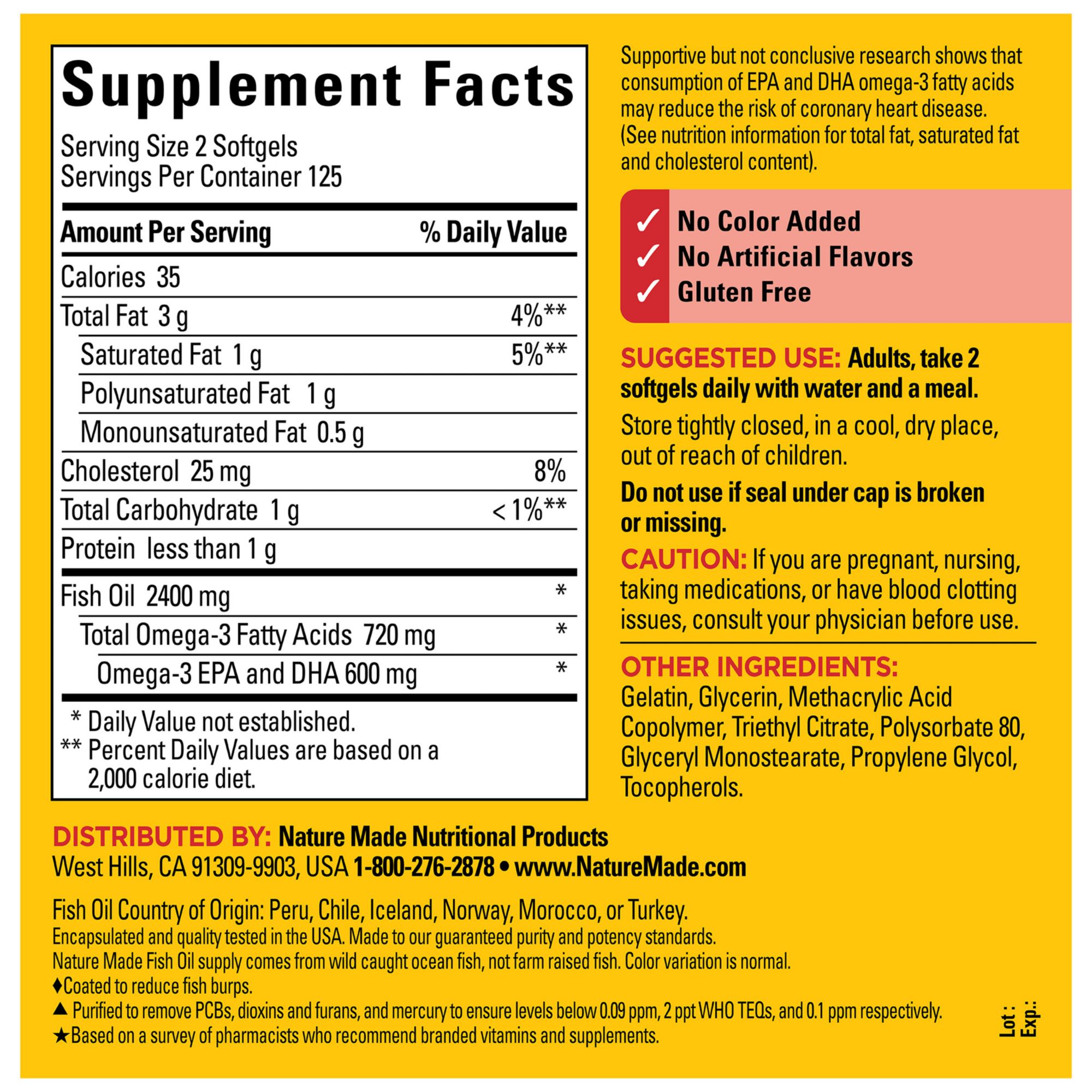 Nature Made Burp Less** Fish Oil 1200 mg is a dietary supplement that provides 360 mg Omega-3 fatty acids per softgel to help support a healthy heart. A serving of two Nature Made Fish Oil Omega 3 softgels provides 2400 mg Fish Oil with 720 mg Omega 3s (600 mg EPA and DHA). Sourced from high quality ingredients, these gluten free Nature Made Fish Oil 1200 mg softgels have no color added and no artificial flavors. Nature Made burp less fish oil supplements for women and men are purified to remove mercury* from wild-caught ocean fish, not farm-raised fish. Adults, take two of these Omega 3 Fish Oil softgels daily with water and a meal. For those who don’t consume fish regularly, an Omega 3 supplement like fish oil Nature Made can help provide Omega 3 Fish Oil for men and women. Supportive but not conclusive research shows that consumption of EPA and DHA Omega-3 fatty acids may reduce the risk of coronary heart disease. (See nutrition information for total fat and cholesterol content). Nature Made Omega 3 supplements are quality you can trust.