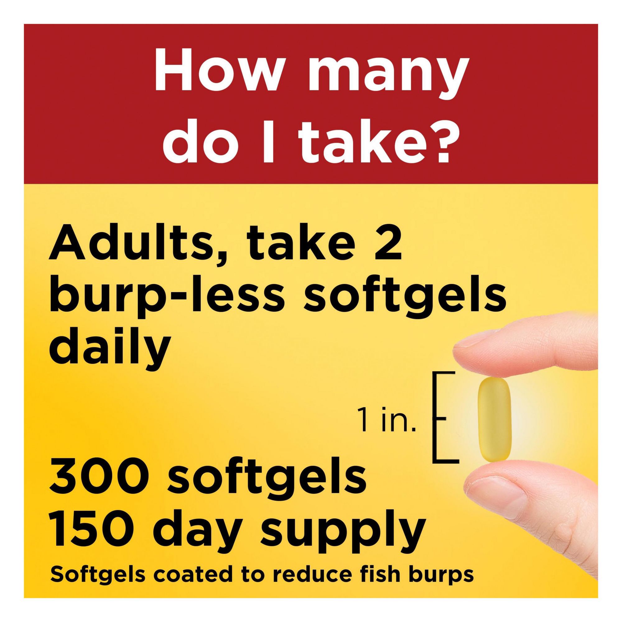 Adults, take two Nature Made Omega 3 Fish Oil softgels daily with water and a meal