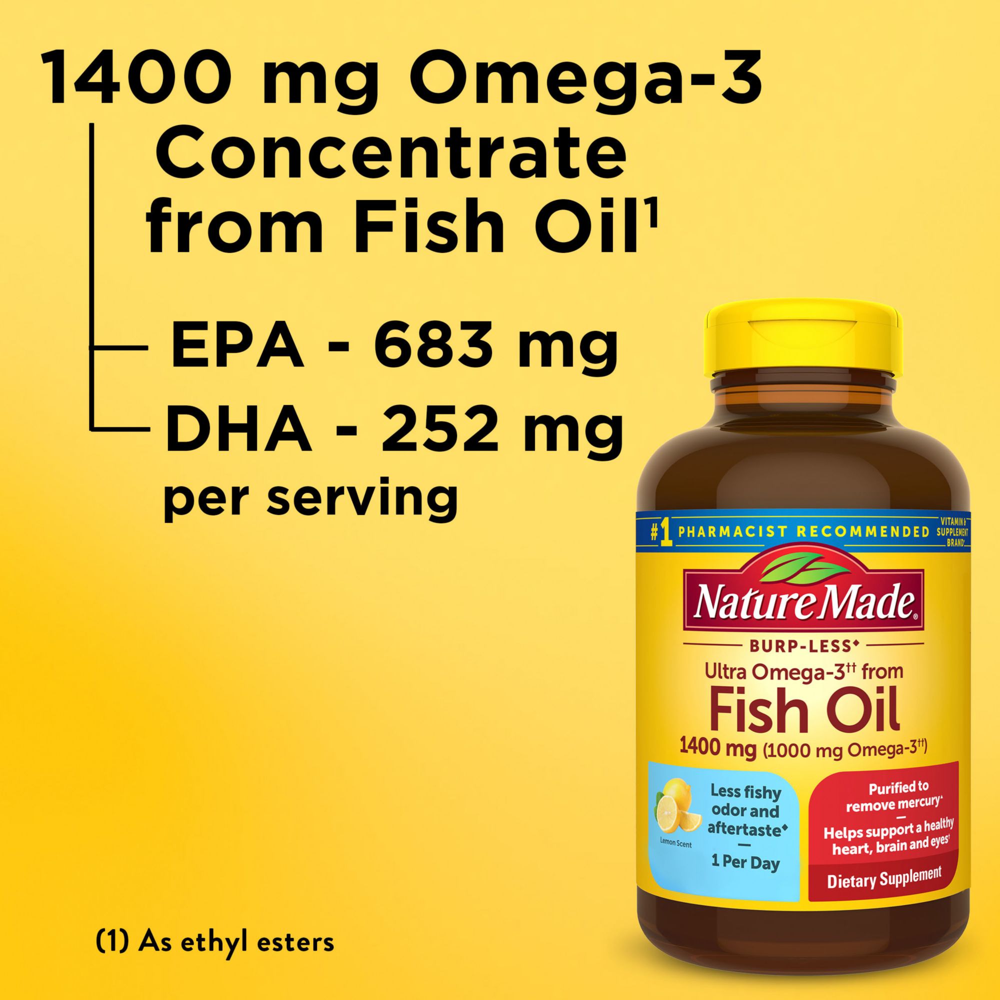 Nature Made Burp Less† Ultra Omega-3* from Fish Oil 1400 mg Softgels, lemon scent, are dietary supplements formulated to help support a healthy heart, brain and eyes. Sourced from high quality ingredients, this Nature Made Omega 3 Fish Oil for men and women is a gluten-free Omega 3 supplement* that has no color added, no milk and no shellfish. Offering 1400mg Omega-3* concentrate from Fish Oil (EPA - 683 mg, DHA - 252 mg) per softgel, these Nature Made Ultra Fish Oil supplements support heart, brain and eye health. For those who don’t consume fish regularly, a Fish Oil for women and men like this Nature Made Ultra Omega 3 fish oil supplement* can help provide Omega-3s. Adults, take one Nature Made Ultra Fish Oil 1400 mg (1000mg Omega-3)* softgel daily with water and a meal for optimal absorption. Supportive but not conclusive research shows that consumption of EPA and DHA Omega-3 fatty acids may reduce the risk of coronary heart disease. (See nutrition information for total fat and cholesterol content). Nature Made Fish Oil Omega 3 supplements are quality you can trust.